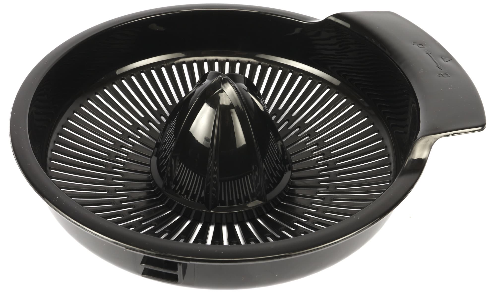Насадка-соковыжималка из прочного пластика состоит из двух деталей: поддона-решетки и вращающейся головки.