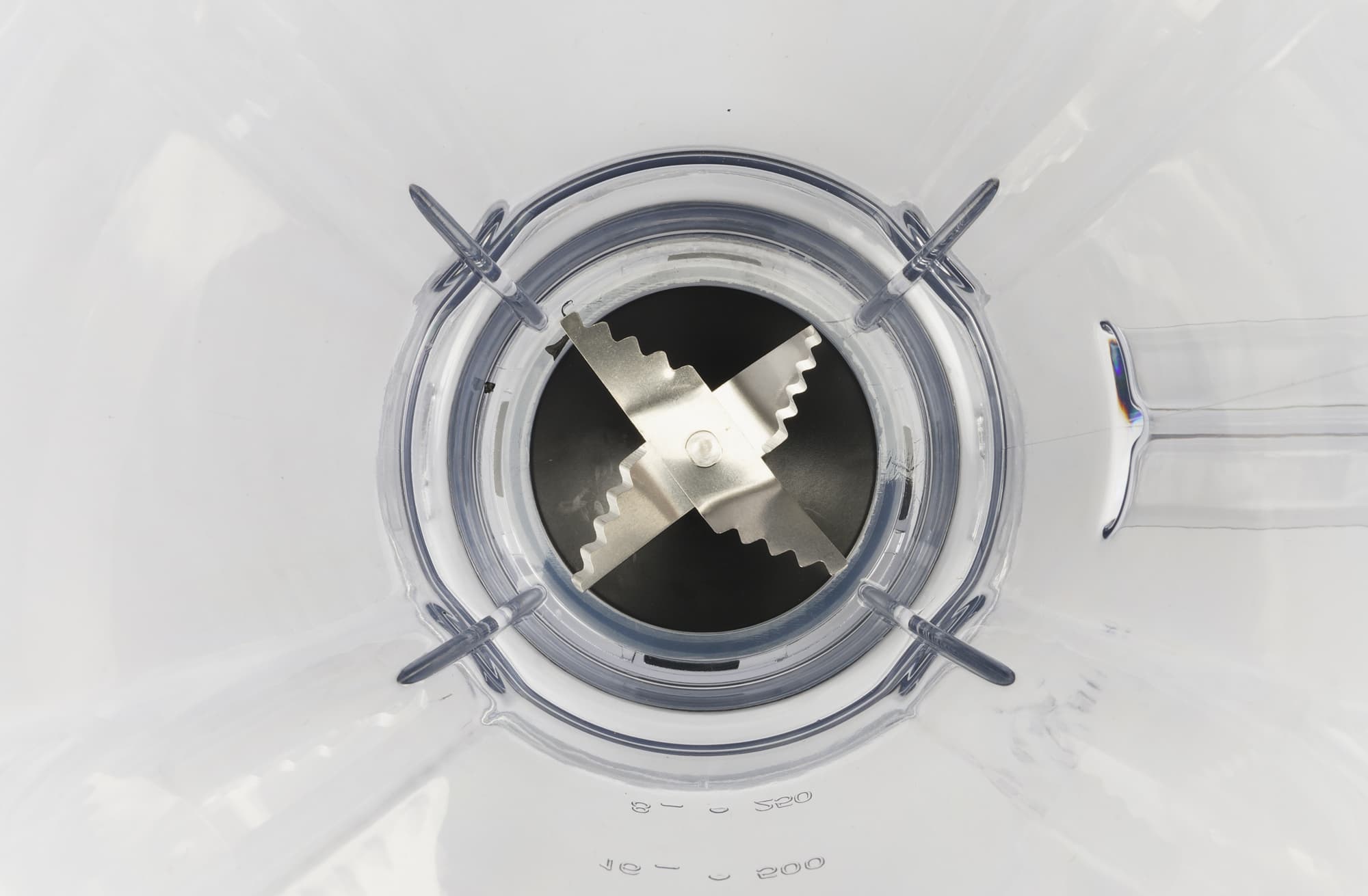 Блок ножей четырехлепестковый, одна пара лезвий ориентирована вниз, вторая пара — вверх. Объем емкости составляет 350 мл.