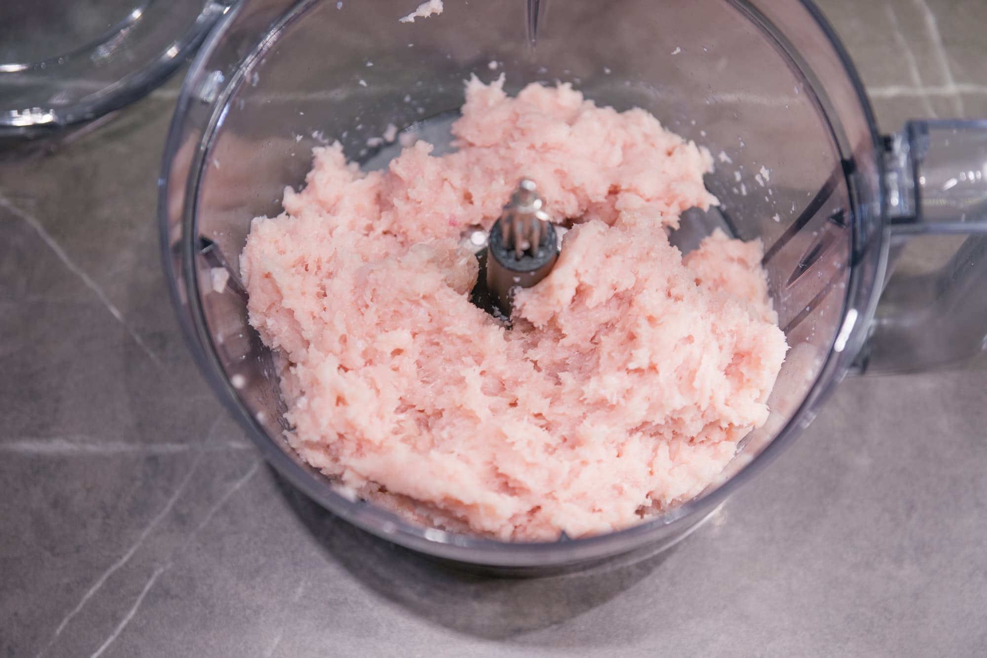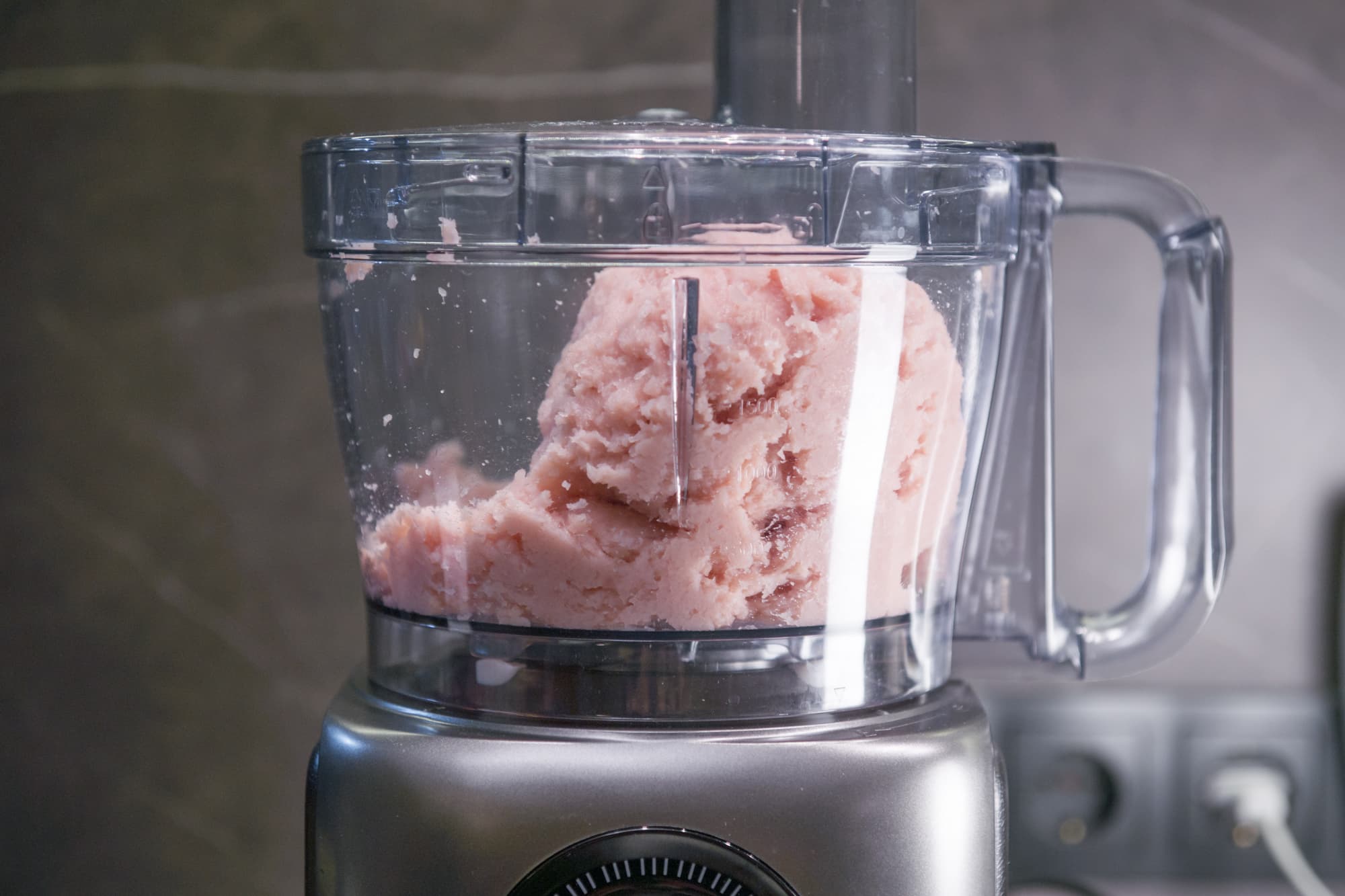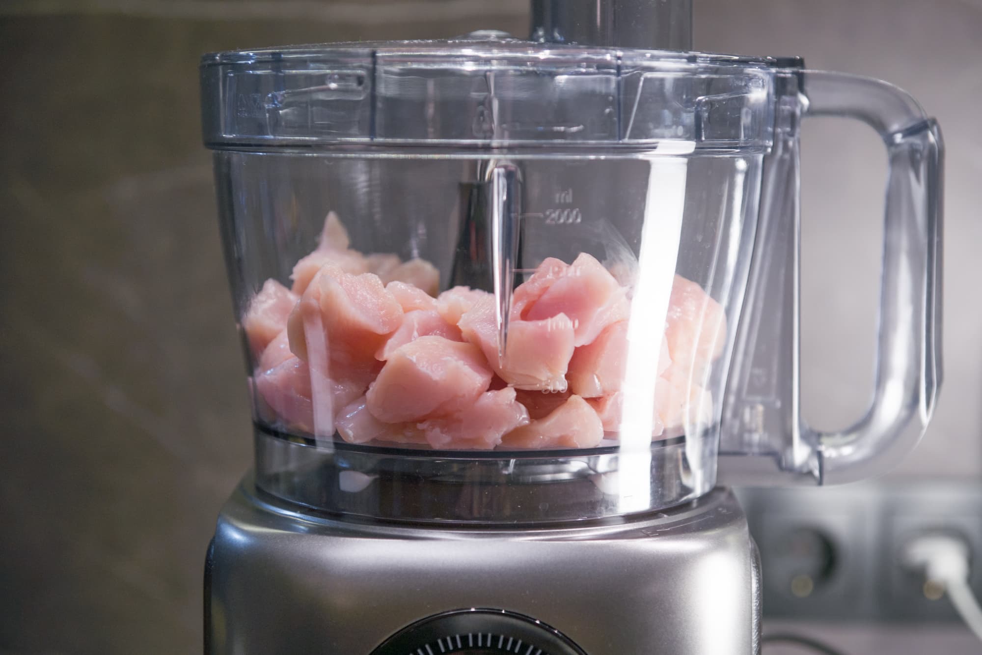 Обычно при приготовлении фарша из куриной грудки в классическом небольшом измельчителе блендера приходится загружать мясо маленькими порциями. Но у Redmond FP607 большая вместительная чаша, и мы рискнули обработать в ней всю имеющуюся упаковку за один раз. 850 г филе нарезали на куски среднего размера, выложили в чашу и запустили авторежим «Мясо».
