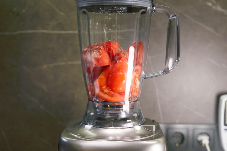 Для нашего первого традиционного теста мы разрезали томаты на 4-6 частей и сложили их в кувшин блендера.