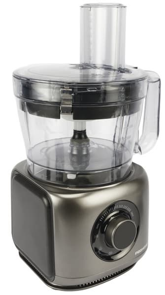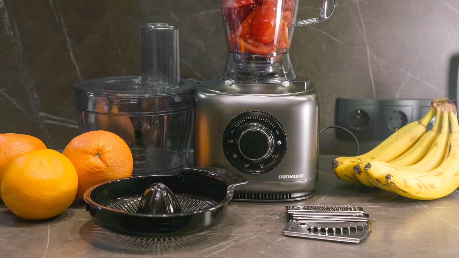 Прибор имеет приятный современный дизайн, прост в сборке и подготовке к работе. За безопасность при эксплуатации отвечают две системы: первая не позволяет устройству включиться в случае неправильной сборки, а вторая автоматически отключает двигатель при перегрузке. Также к плюсам отнесем легкость кувшина блендера и чаши комбайна. Результаты работы всех насадок оказались стабильными. Комбайн выполняет все свои функции как минимум очень хорошо.
