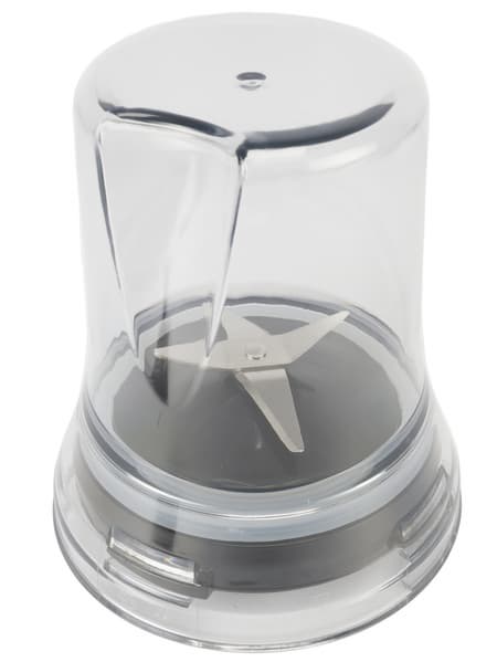 Насадка-кофемолка состоит из двух частей — прозрачной пластиковой колбы и крышки-переходника со съемным блоком ножей.