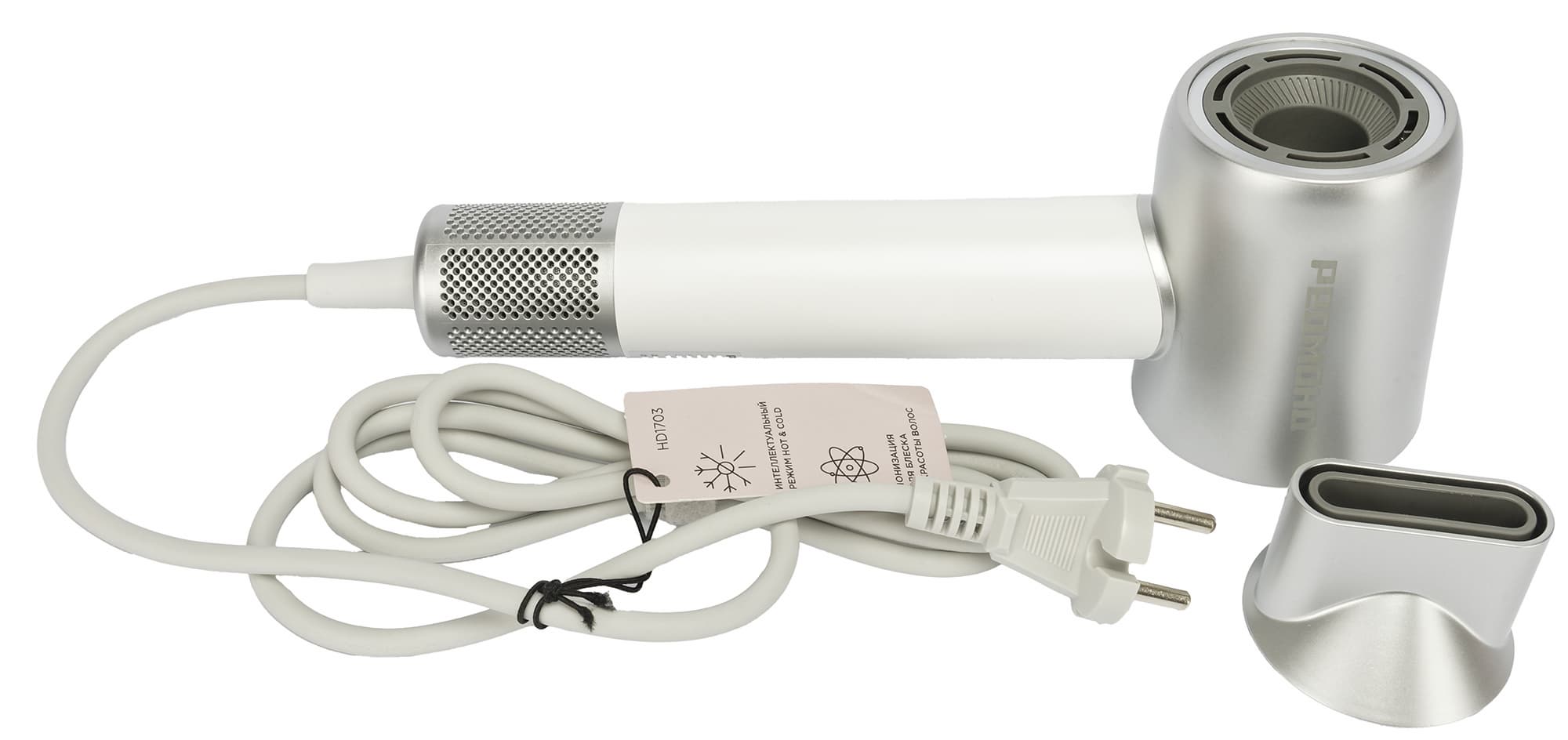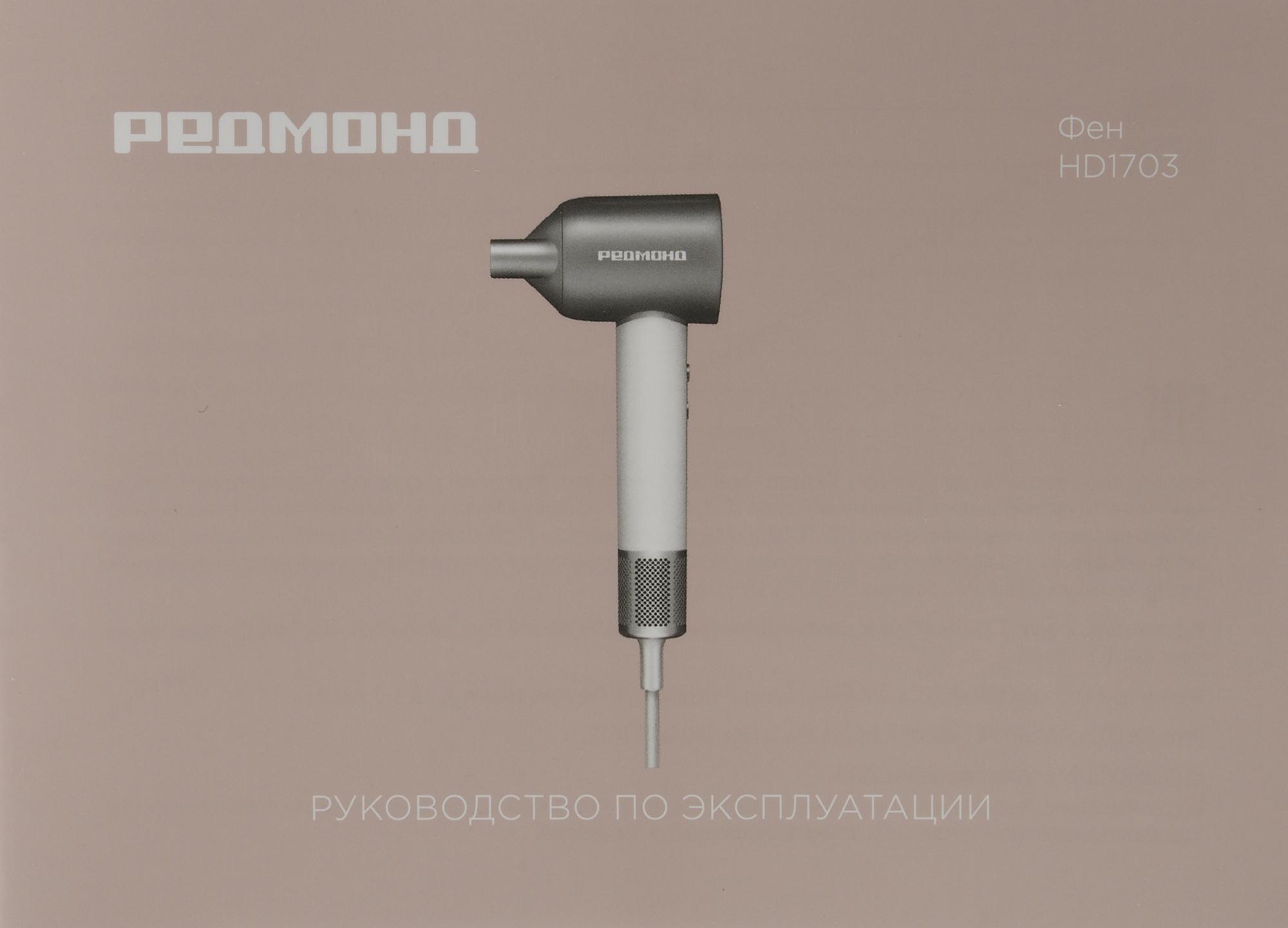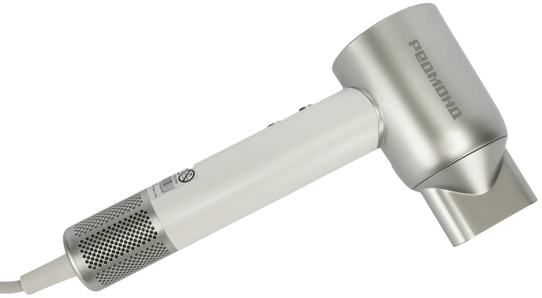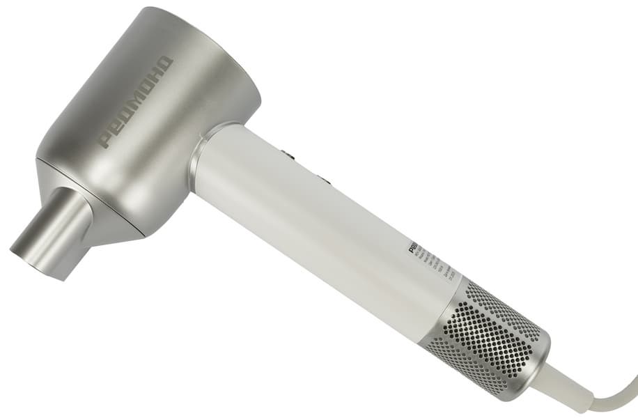 Пластиковый матовый корпус Redmond HD 1703 в бело-серебристой расцветке смотрится свежо и симпатично.