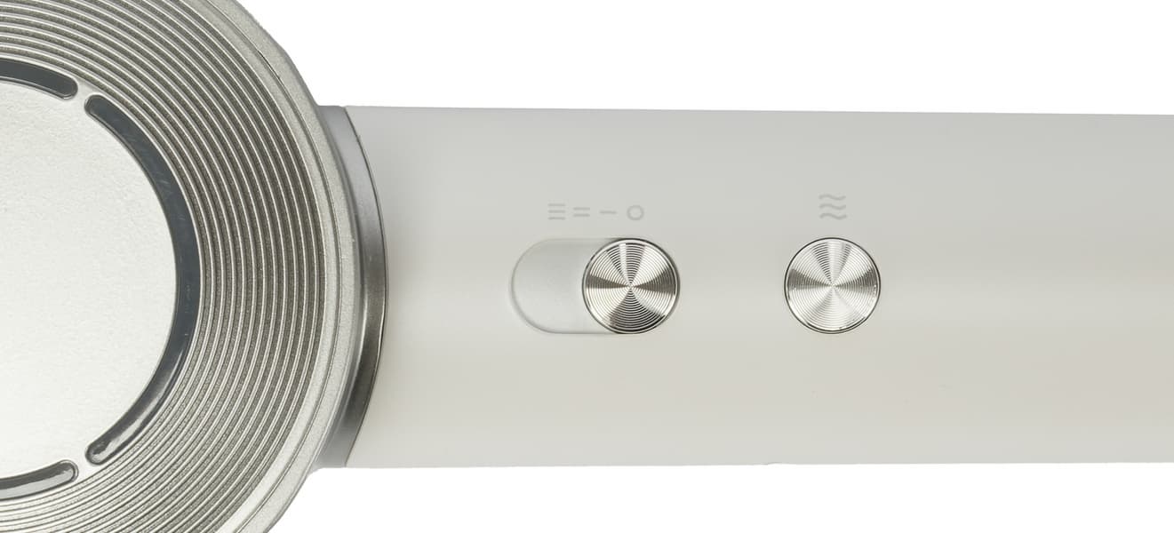 Устройство комфортно располагается в руке, вес корпуса оказался практически неощутим. Кнопка и переключатель расположены удобно. Они слегка выступают из ручки, нажимаются с легким усилием и не срабатывают от случайного касания. Управление с цветной индикацией элементарно и удобно. Температурные режимы переключаются по кругу, так что после холодного воздуха сразу включить горячий нельзя, но уровней нагрева всего четыре и фен моментально реагирует на переключение, так что в общем-то никаких проблем мы тут не ощутили.