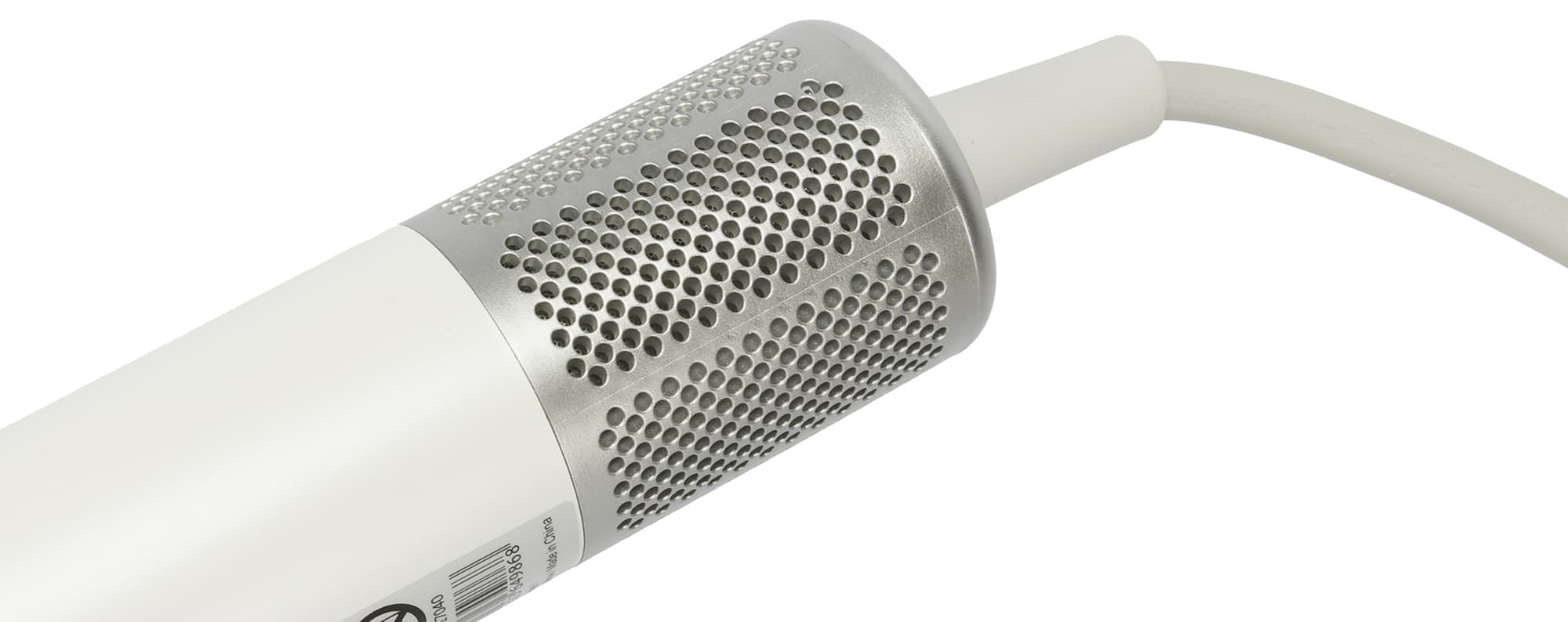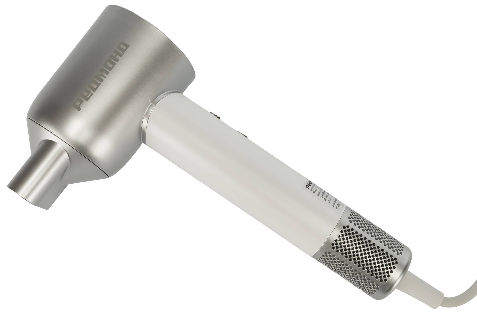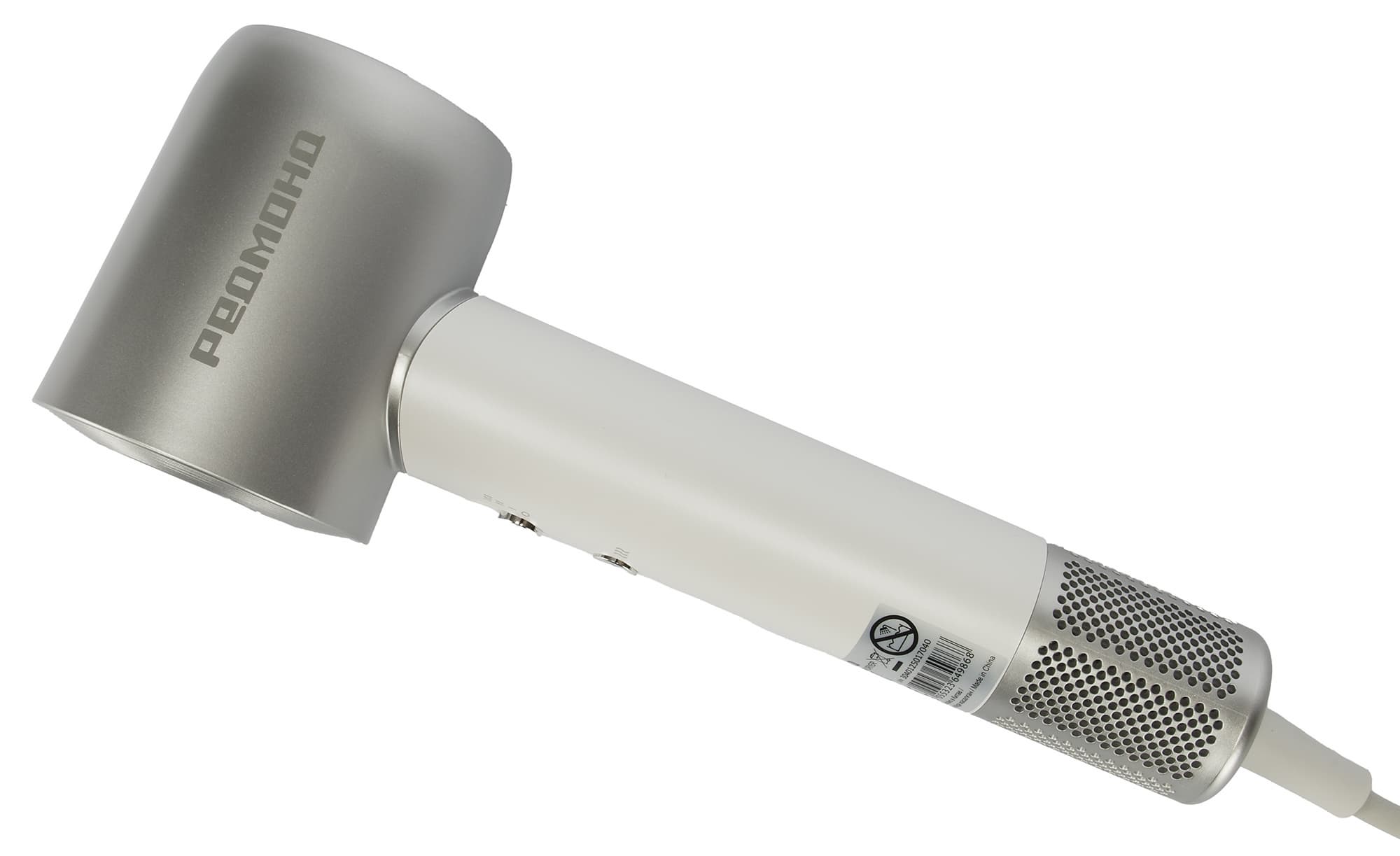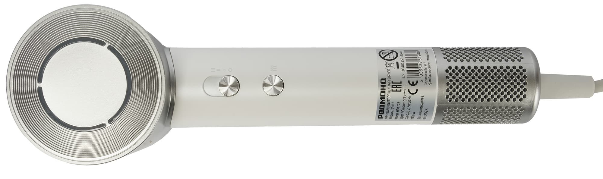 Выше на корпусе есть наклейка со штрих-кодом и технической информацией об устройстве. Ручка фена длиной 18 см и диаметром 3,5 см не складывается.