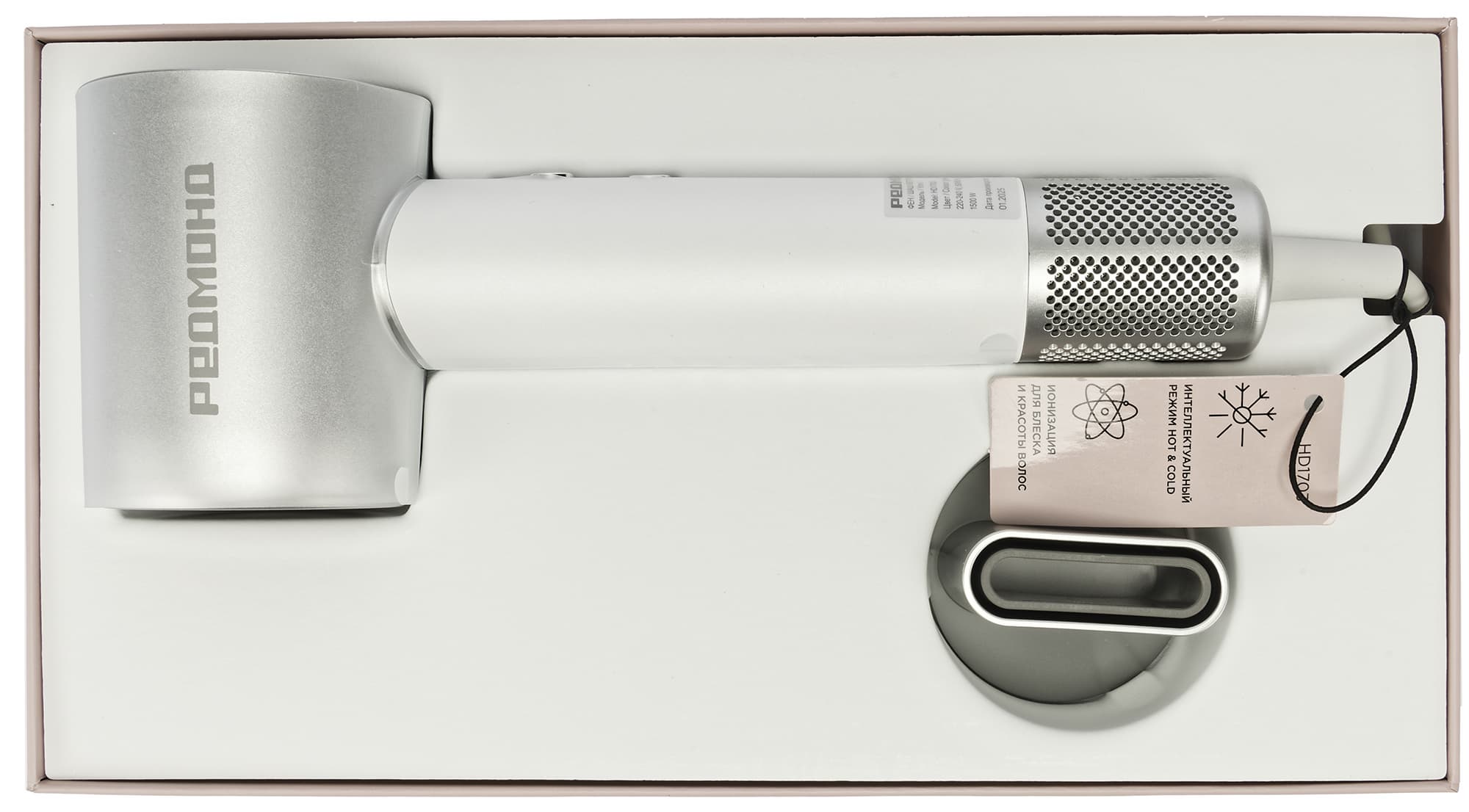 Внутри короба фен и насадка-концентратор уложены в вырезы картонного ложемента. К фену прилагаются инструкция и гарантийный талон.