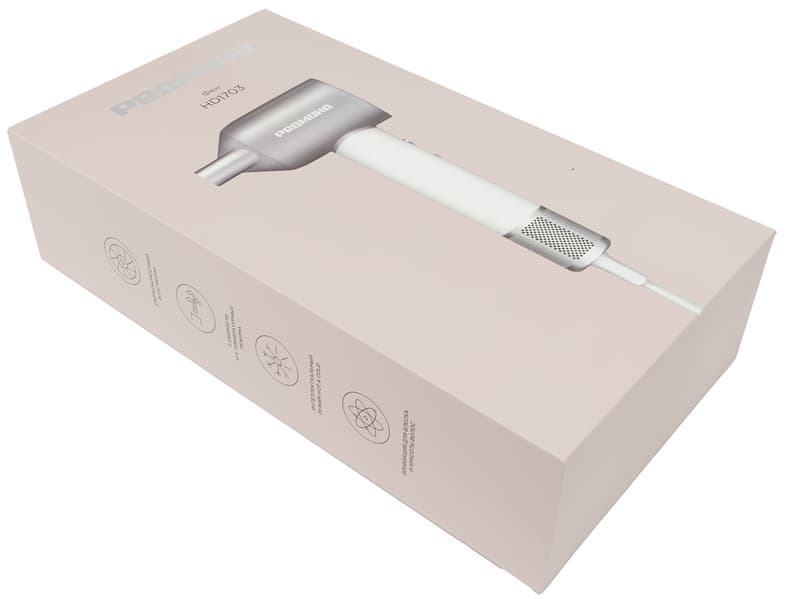 Упаковка Redmond HD 1703 выполнена в виде картонного короба приглушенного розового цвета. На лицевой стороне упаковки размещена фотография фена, логотип компании и полное наименование модели, на боковых гранях — также логотип бренда и пиктограммы с обозначением главных особенностей устройства. На обратной стороне приведены технические характеристики прибора на трех языках, информация о производителе и наклейка со штрих-кодом и серийным номером.