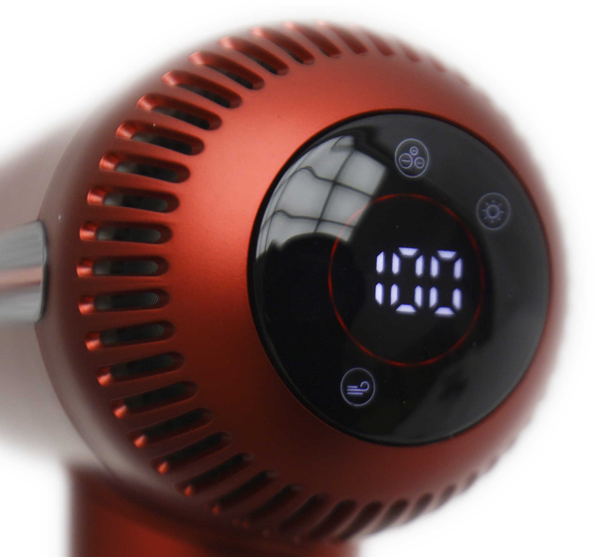 С рабочей стороны у нашего фена имеется магнитное кольцо для крепления насадки. С противоположной стороны, там, где обычно располагается воздухозаборное отверстие, мы видим закрыт пластиковую крышку с миниатюрным светодиодным дисплеем. Воздух попадает внутрь через съемную решетку, расположенную вокруг дисплея.