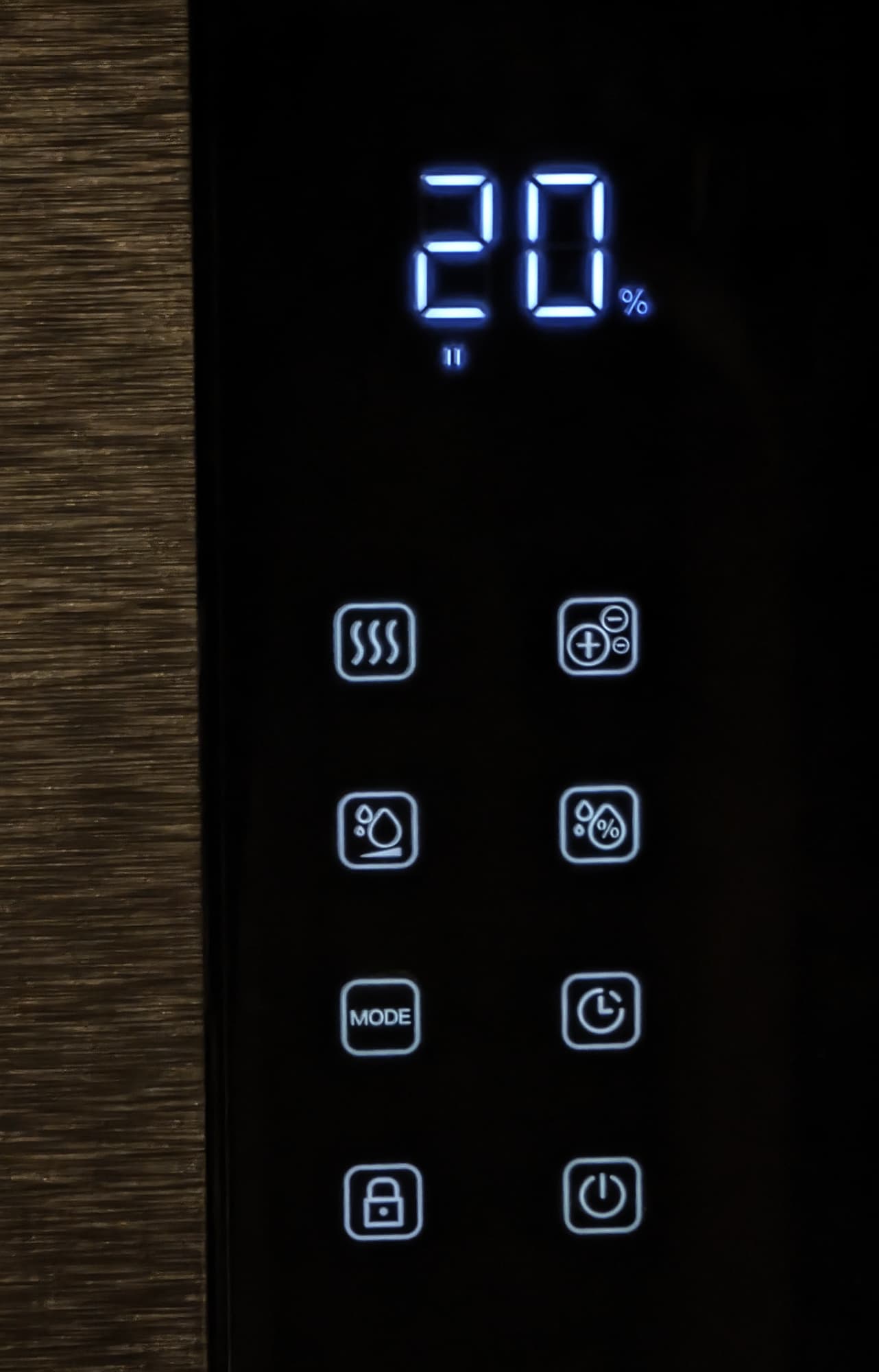 На дисплее включенного устройства появляются показания встроенного гигрометра и термометра. Под белыми цифрами относительной влажности и температуры отображается текущий уровень увлажнения (их у нашего устройства три) и символы дополнительных функций.