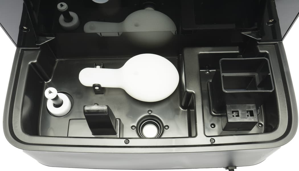 На съемной верхней крышке расположен вращающийся диффузор, который направляет в нужную сторону струю пара. Два сопла вращаются независимо друг от друга, поэтому увлажненный воздух можно направить в одну область комнаты или развести потоки — даже на 180°.