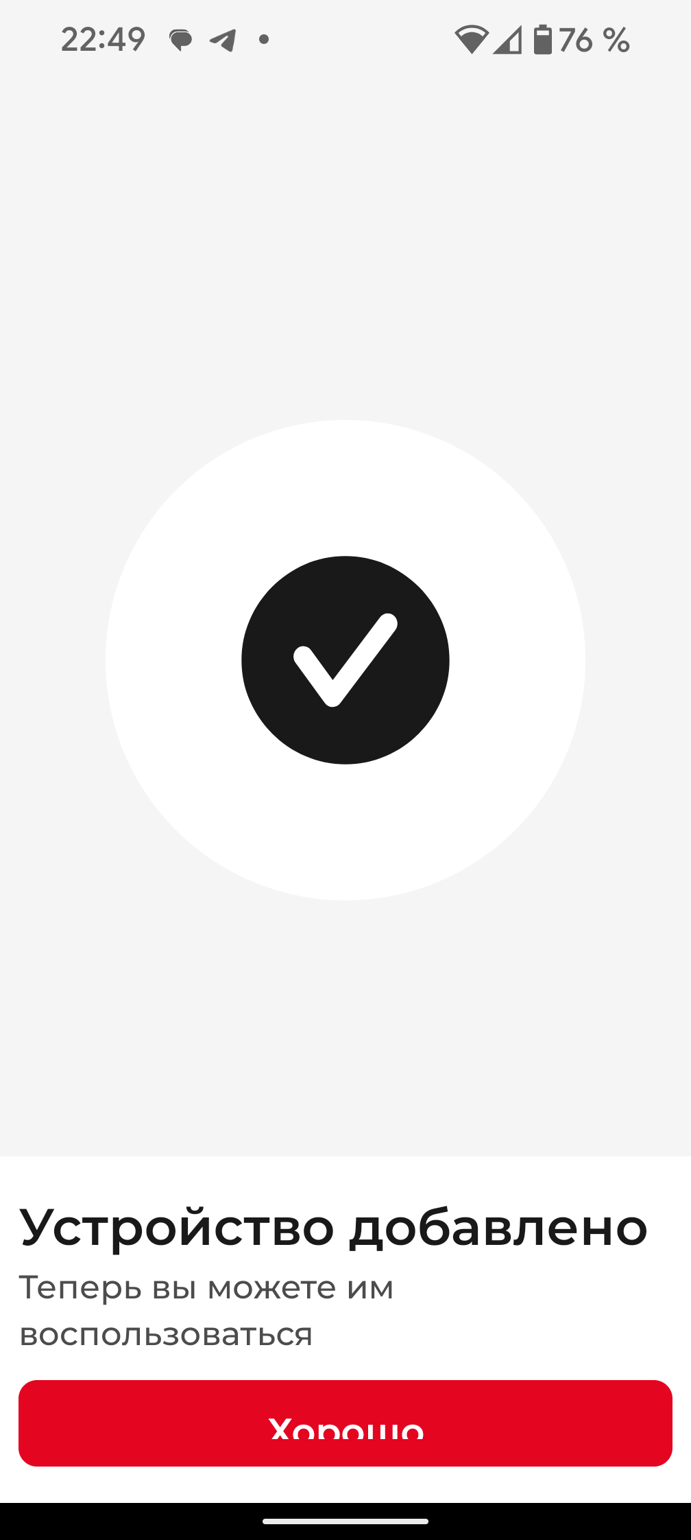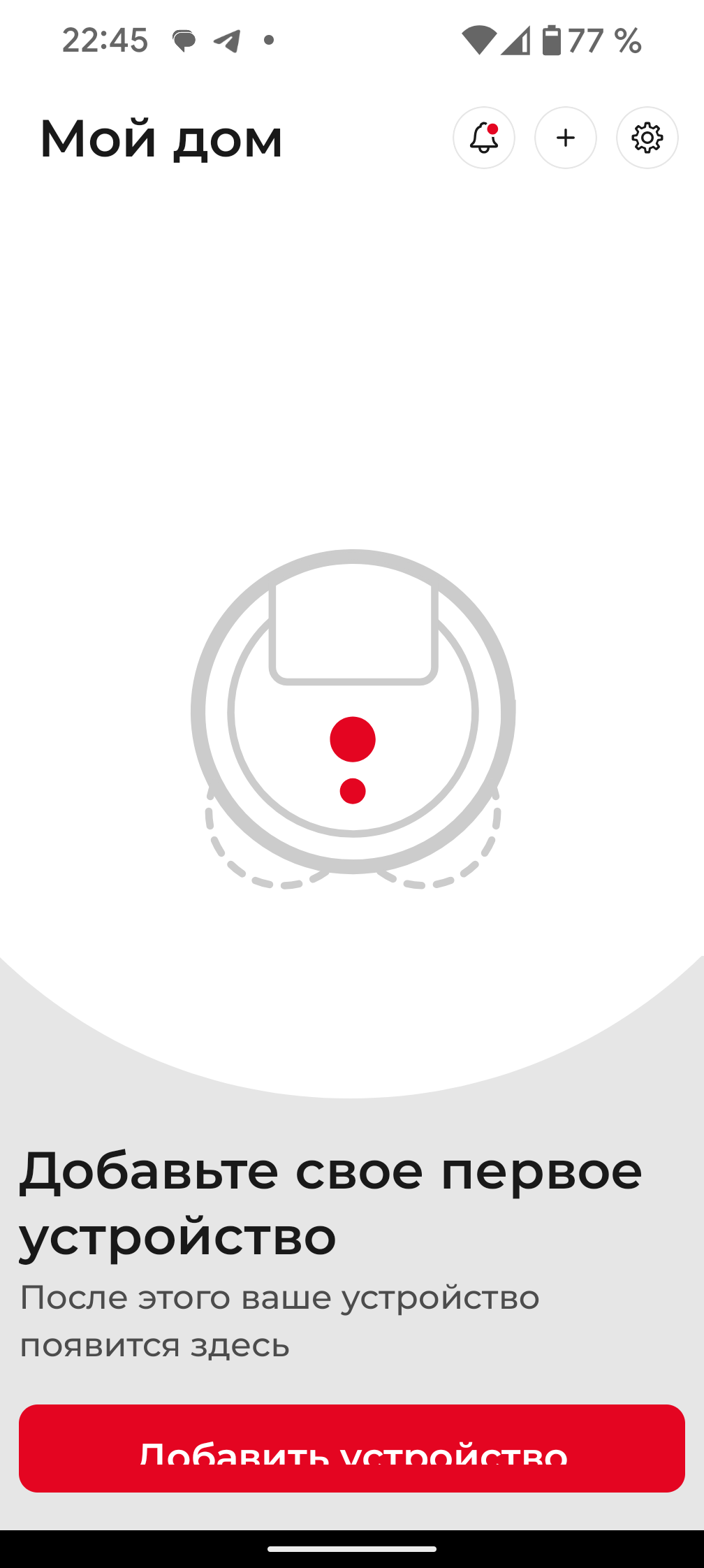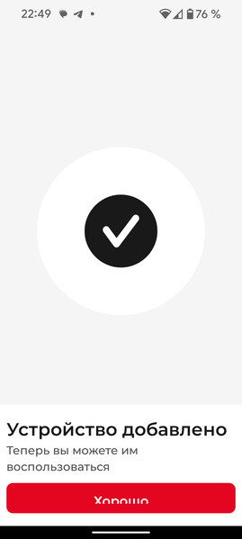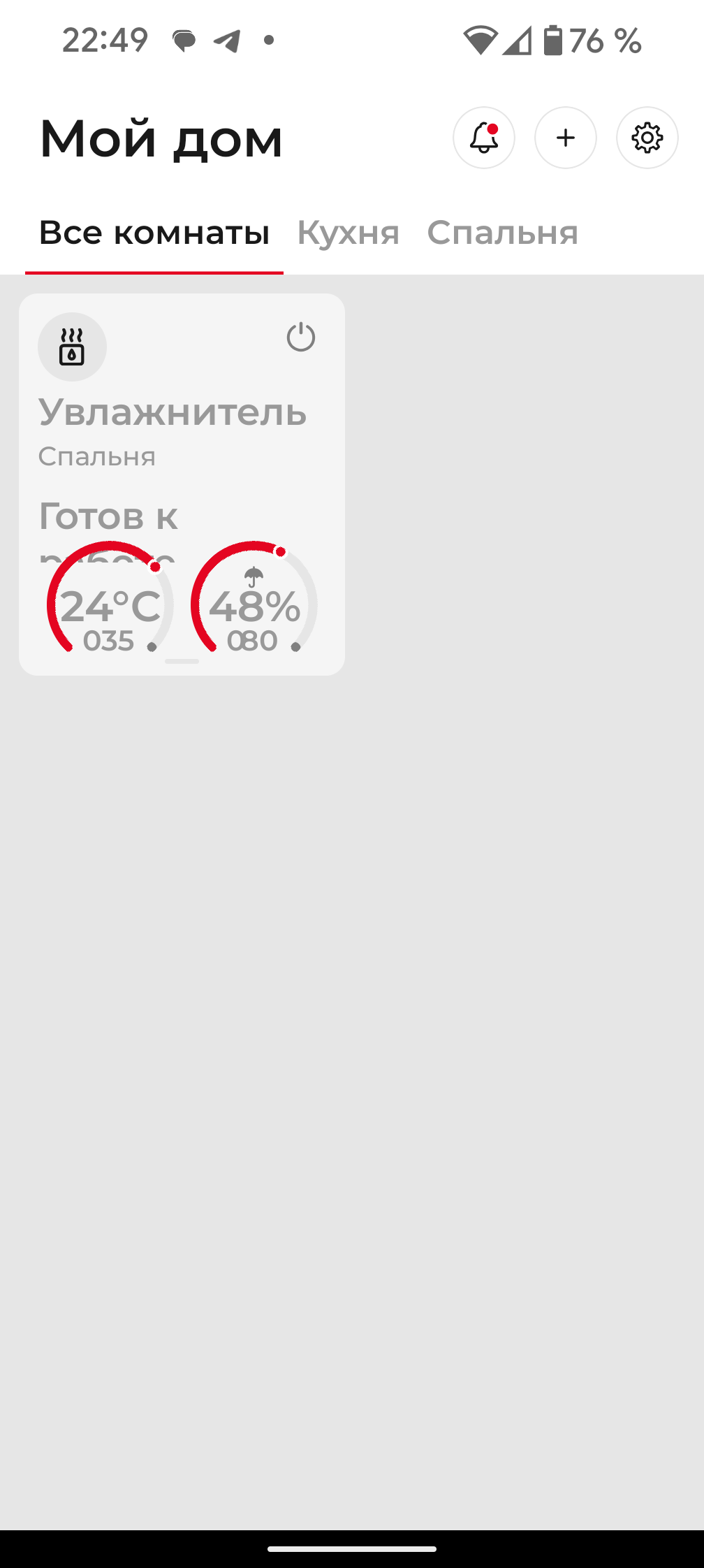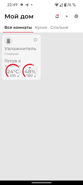 На главном экране приложения появляется наш увлажнитель. Виджет прибора показывает его статус, текущие параметры микроклимата и установленное значение целевой влажности.