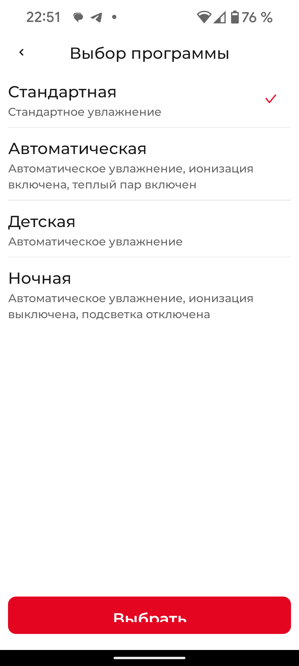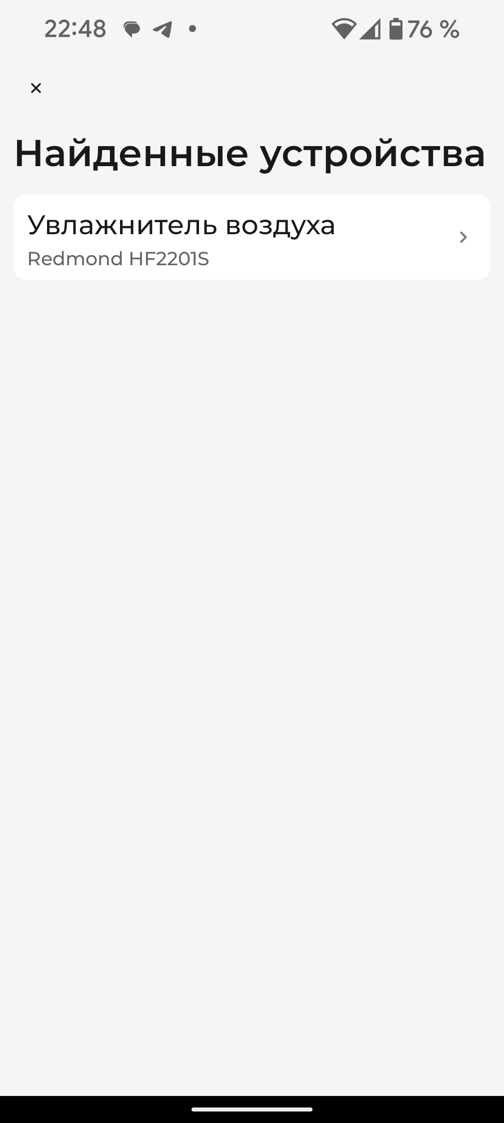 После нажатия на кнопку «Добавить устройство» мы попадаем на экран выбора поддерживаемых моделей. Автоматическое добавление устройства в нашем случае не сработало: пришлось вручную выбрать «Redmond HF2201S» на вкладке «Увлажнители воздуха».