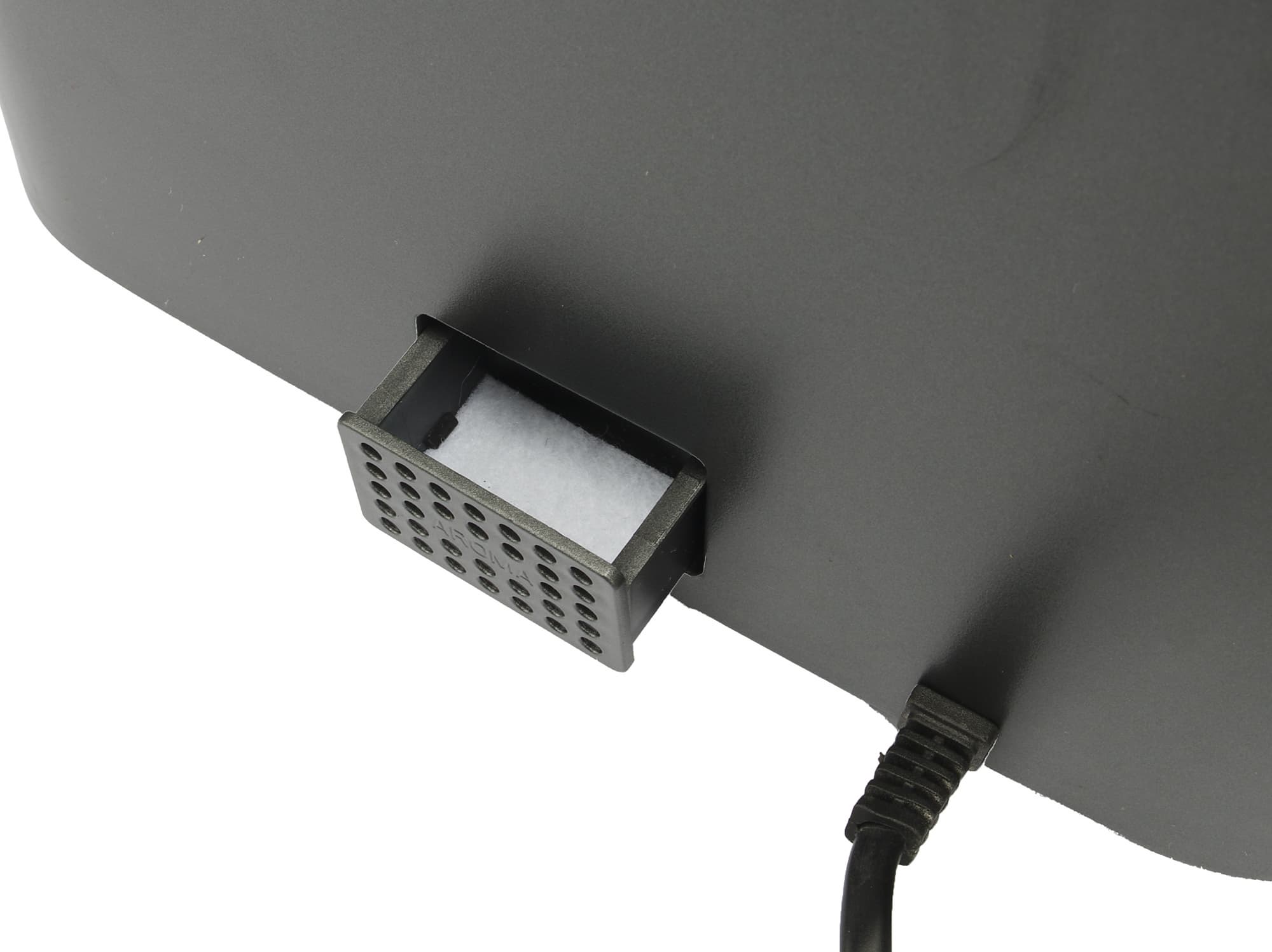 Верхняя панель представляет собой съемную крышку с резиновым язычком, выполняющим функцию ручки. Поток увлажненного воздуха выходит через продолговатое отверстие, возможности регулировать направление пара у этой модели нет.