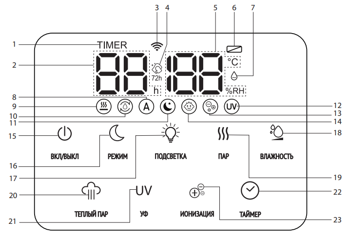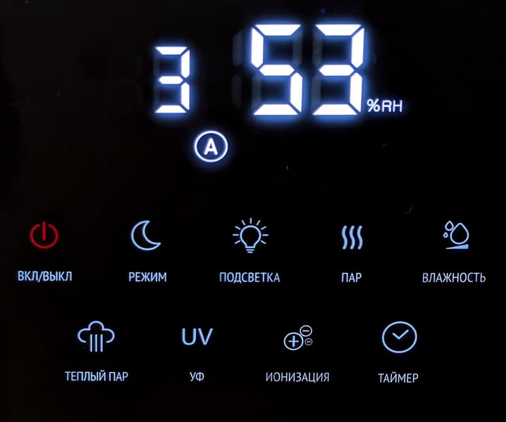 На крупном цифровом дисплее отображаются, сменяя друг друга, текущие значения температуры и относительной влажности в помещении. Слева от них при активации таймера зажигается отсчет времени до отложенного выключения. Между цифровыми дисплеями предусмотрено место для индикатора активности интерфейса Wi-Fi и сигнального светодиода, предупреждающего о необходимости произвести очистку прибора.