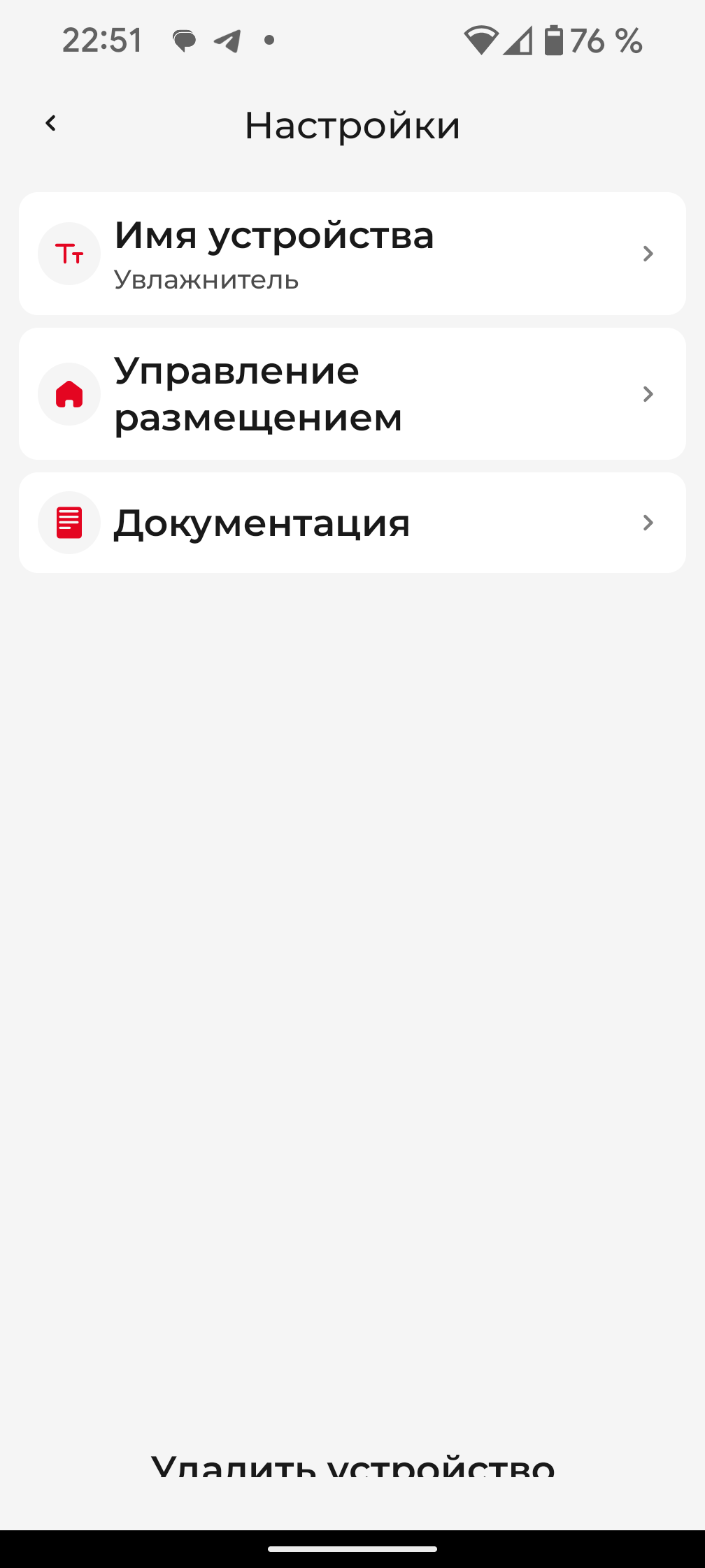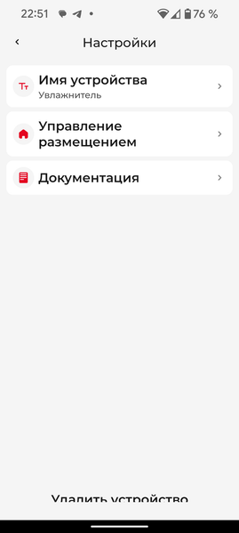 В разделе настроек мы можем переименовать устройство, переместить его в другую комнату нашего умного дома и ознакомиться с онлайн-версией руководства по эксплуатации. Здесь же можно удалить прибор из приложения.