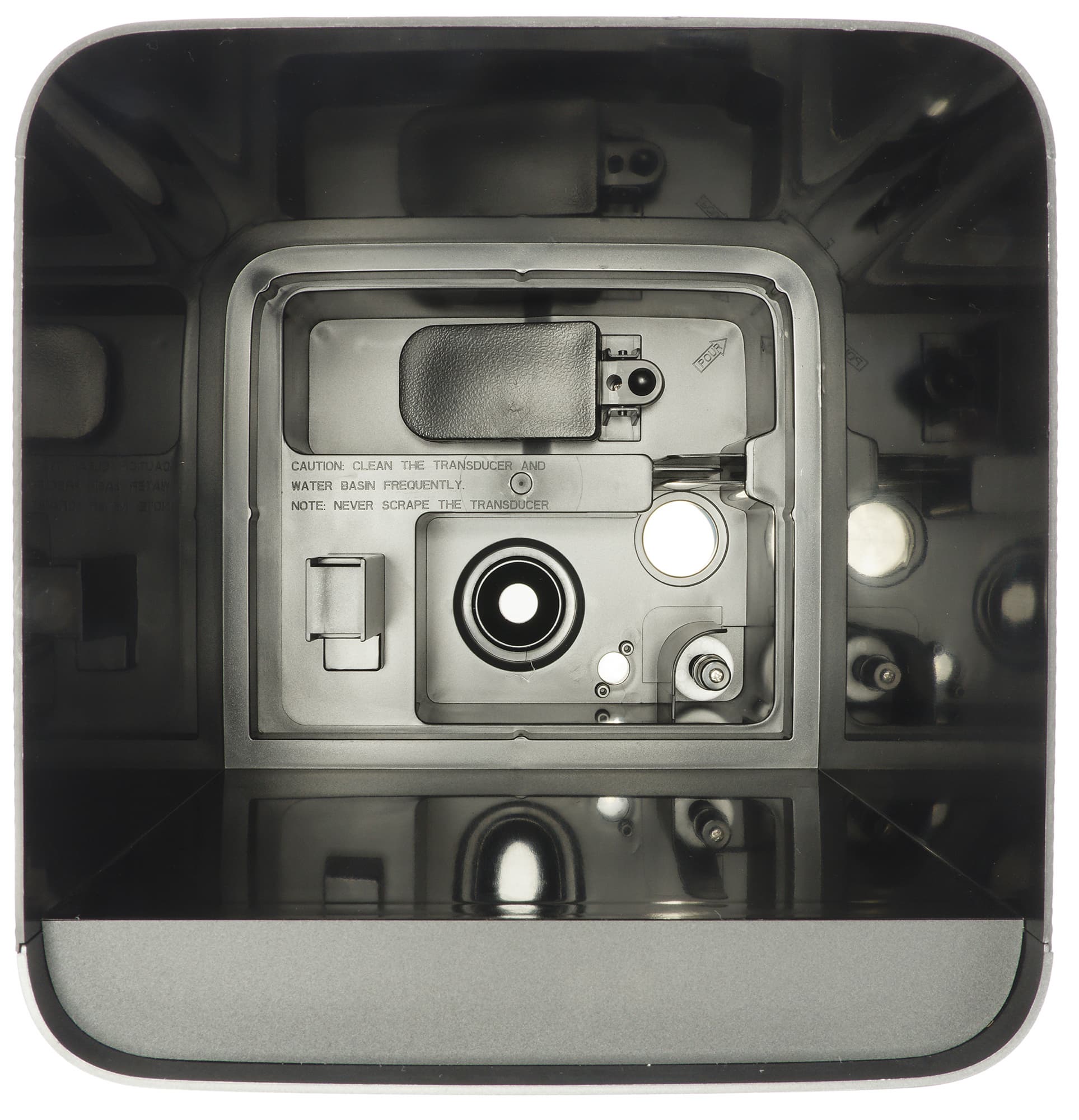 На дне рабочей камеры мы видим пьезокерамическую мембрану, превращающую воду в холодный пар, и поплавковый датчик, отвечающий за отключение прибора, когда уровень воды становится ниже минимума. Здесь же расположен нагревательный элемент, включающийся при активации функции «теплый пар».