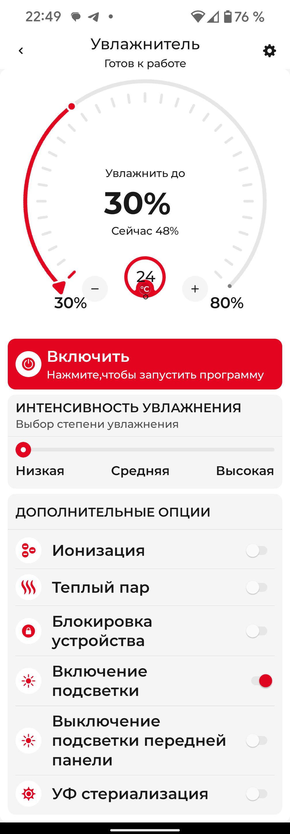 На странице приложения мы видим круглое меню выбора целевой температуры, слайдер установки степени увлажнения и кнопки выбора дополнительных функций.