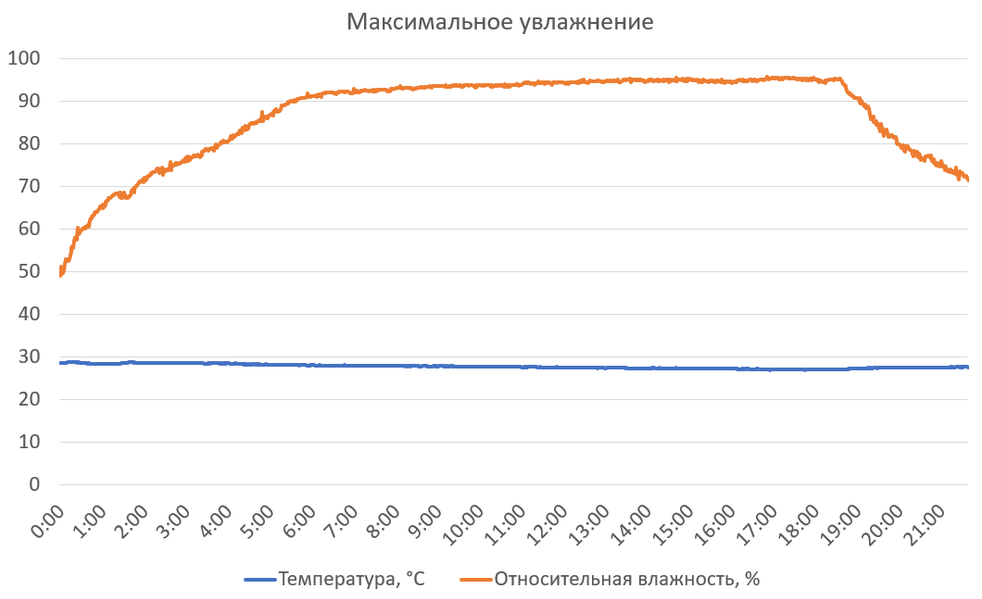 Для минимизации влияния внешних факторов мы плотно закрыли двери и окна. Между тестами помещение тщательно проветривали. Измерения температуры и влажности воздуха проводились в автоматическом режиме, в комнате не было ни людей, ни животных.