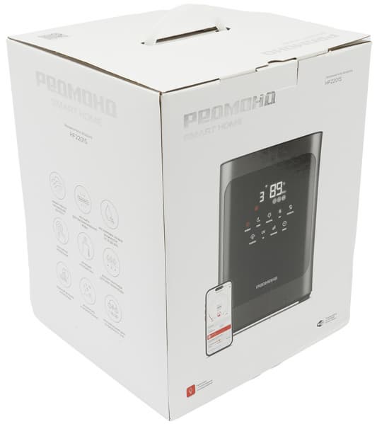Увлажнитель поставляется в белой коробке из картона, оформленной в фирменном стиле Redmond. На передней стороне упаковки мы видим фотографию работающего устройства. Рядом с ним дизайнер разместил изображение смартфона с запущенным приложением: наш прибор управляется через Wi-Fi.