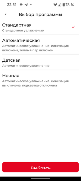 В меню выбора программ доступны подсказки, разъясняющие назначение и логику работы устройства во всех четырех режимах. Отметим, что детский режим здесь описан крайне скупо: мы помним, что на этой программе влажность поддерживается на уровне 55%, а функции «Теплый пар», ионизации и УФ-стерилизации включены.