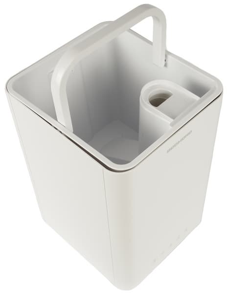 Корпус увлажнителя сделан из белого матового пластика с незначительным количеством глянцевых элементов. Нижняя часть корпуса (крышка на дне) — серебристая, впрочем, заметить это можно, только если сильно постараться (или перевернуть увлажнитель вверх ногами).