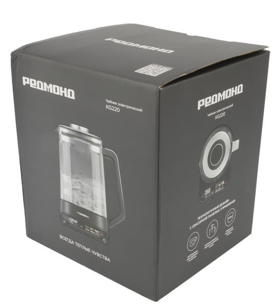 Redmond KG220 поставляется в компактной коробке, с качественной полноцветной печатью, оформленной в фирменной стилистике бренда. На боковых гранях мы видим крупные фотографии устройства, тут же приведена краткая информация о его особенностях, а также основные технические характеристики и данные производителя.