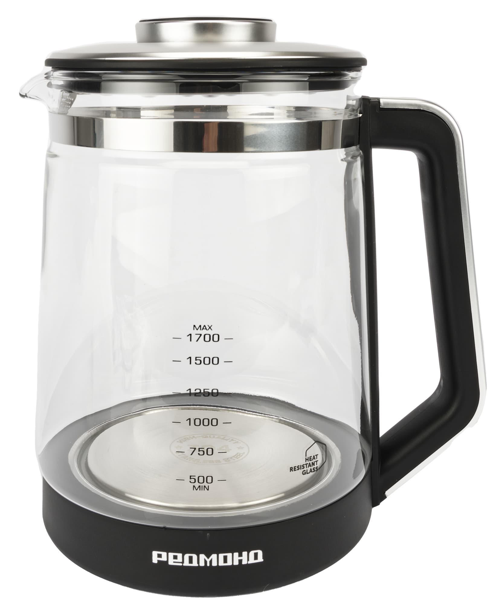 Корпус и база Redmond KG220 выполнены из пластика, а колба — из стекла. На крышке и с внешней стороны ручки есть вставки из серебристого металла.