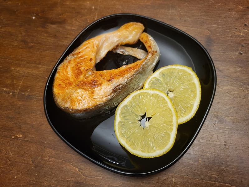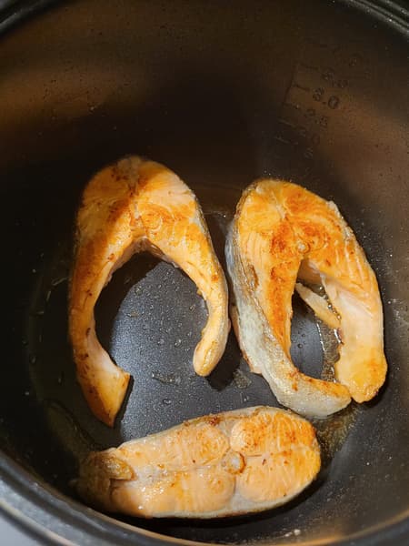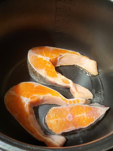 Следующим был стейк из форели. Запустили автоматическую программу «Жарка», положили на дно чаши мультиварки рыбный стейк, предварительно посолив и поперчив, и форель была готова еще до окончания программы.