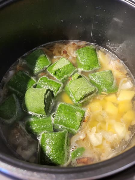 Для тестирования автоматической программы «Суп» мы решили приготовить суп-пюре из шпината. Обжарили на сковороде лук, почистили и порезали картошку, добавили замороженный в брикетах шпинат (такой нам привезли из магазина) и запустили автоматическую программу на 30 минут (время программы по умолчанию — 1 час).