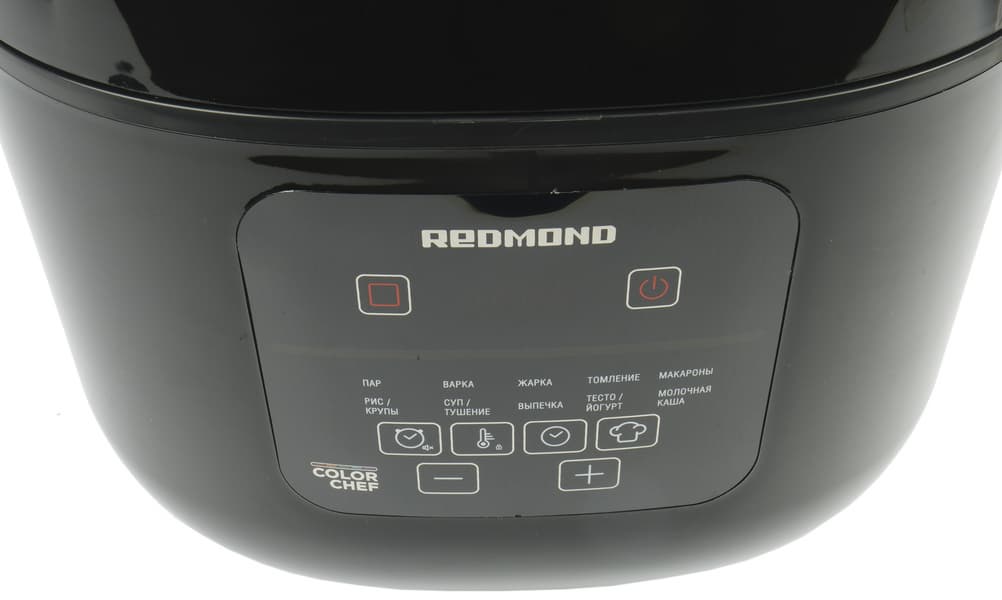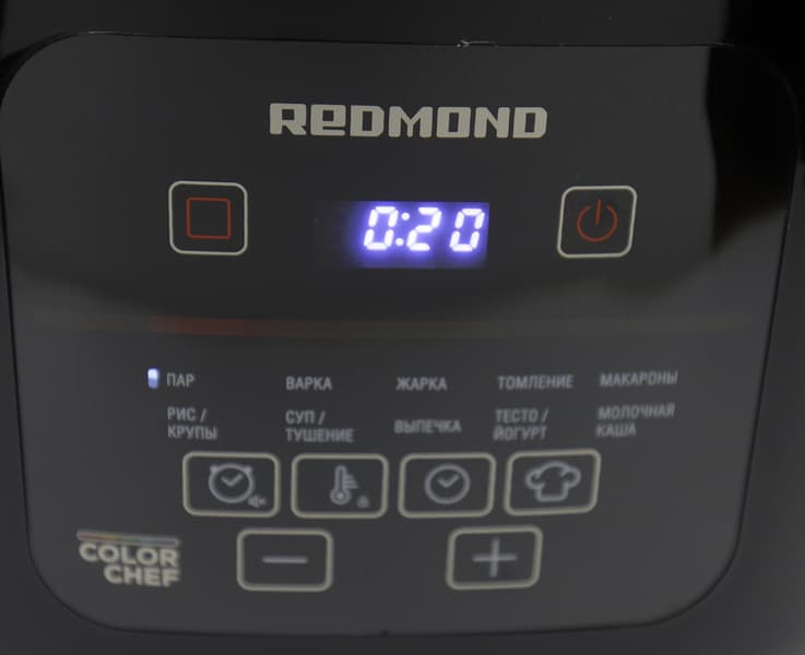 Панель управления расположена удобно, кнопок не очень много, и управление мультиваркой оказывается интуитивно понятным. Светодиодный дисплей яркий, информация на нем легко читается, а сенсорные кнопки нажимаются без труда.