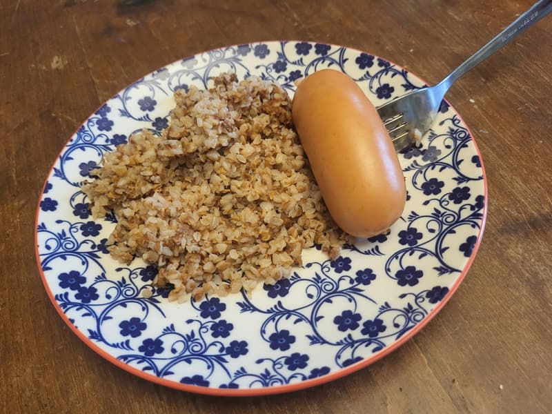 Пока каша варилась, мы думали о том, что неплохо бы добавить в нее жареный лук, но так захотели есть, пока она готовилась, что просто отварили сардельку и съели ее с гречкой.