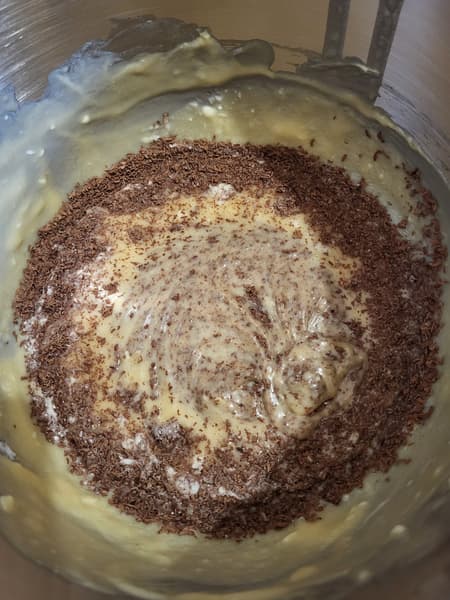 Шоколад натерли на мелкой терке. В отдельной емкости взбили яйца с сахаром до стойкой пены. Непрерывно помешивая, добавили в яичную смесь размягченное сливочное масло, муку, разрыхлитель, тертый шоколад и тщательно перемешали до получения однородной массы (мы воспользовались миксером).