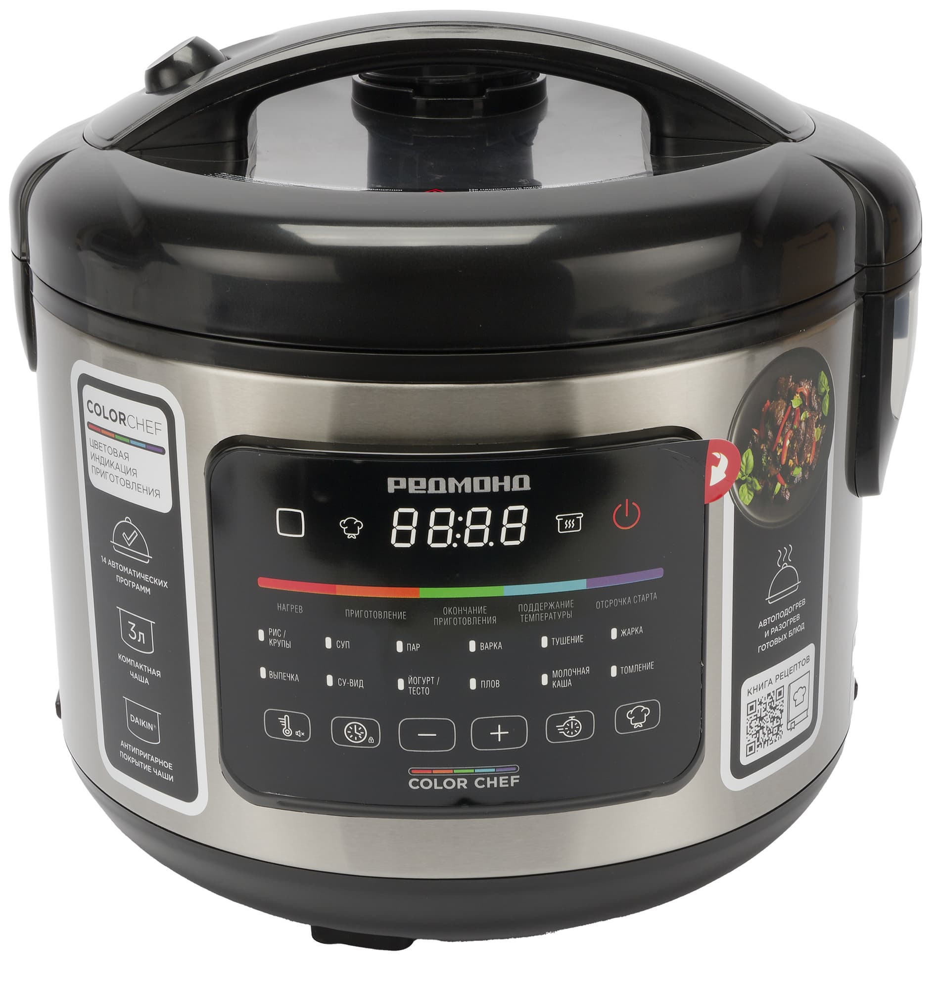 Упаковка выполнена из матового картона с неброской, но качественной полиграфией: на ней размещено изображение устройства и приведены основные технические характеристики модели, включая описание функции Color Chef, при которой этапы приготовления обозначаются разной цветовой подсветкой.