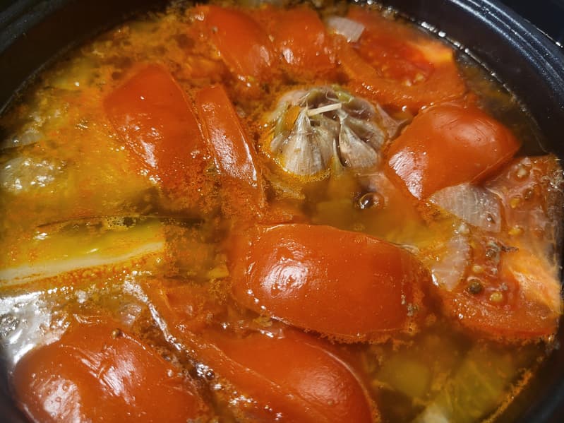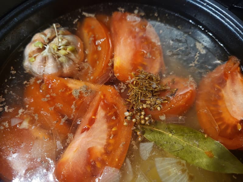 Примерно за полчаса до окончания программы мы положили в суп головку чеснока, помидоры и специи — зиру и кориандр.