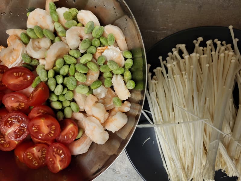 Когда основа супа закипела, мы начали поочередно добавлять ингредиенты: сначала креветки с бобами — примерно на три минуты, затем помидоры, после чего нежные длинные грибы, которым достаточно около 30 секунд варки. При приготовлении на плите такая последовательность не вызывает затруднений, тогда как в мультиварке не всегда очевидно, закипела жидкость после добавления новых ингредиентов или нет.