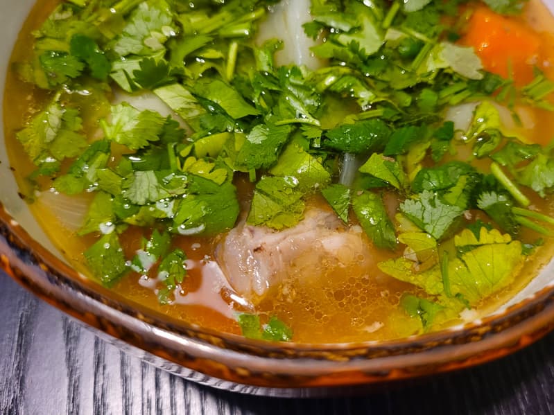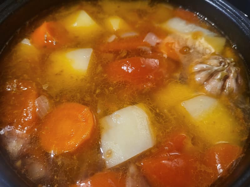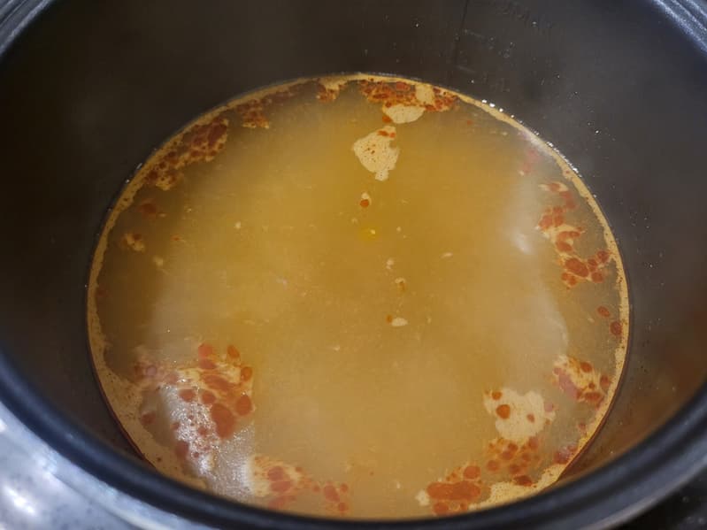 Дальше мы решили приготовить суп, но выбрали для этого не очевидную программу, а программу «Томление», поскольку она обеспечивает стабильную невысокую температуру без активного кипения. В таких условиях бульон остается прозрачным и насыщенным, мясо на кости равномерно размягчается, не теряя сочности, а овощи сохраняют форму и текстуру.