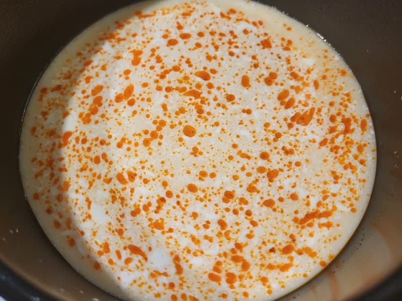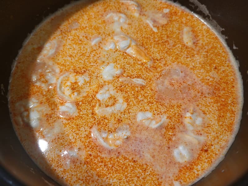 Впрочем, нас это не остановило. Вначале мы развели пасту том-ям в воде и довели ее до кипения. Потом добавили 250 мл кокосового молока.