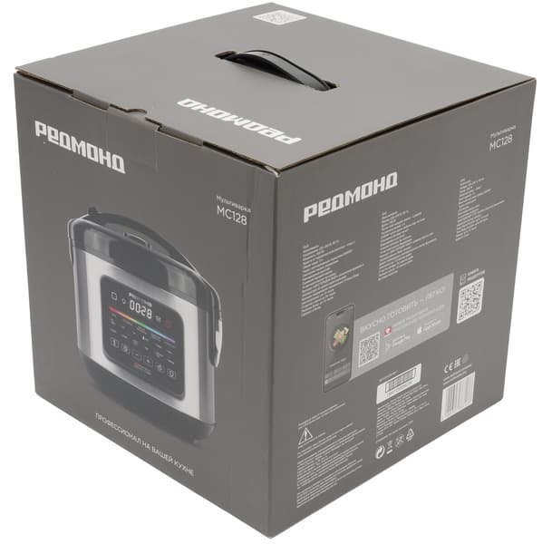 Внутри коробки мультиварка надежно зафиксирована пенопластовыми вставками, предотвращающими смещение и защищающими корпус от механических повреждений при перевозке. Для удобства переноски коробка снабжена встроенной ручкой.