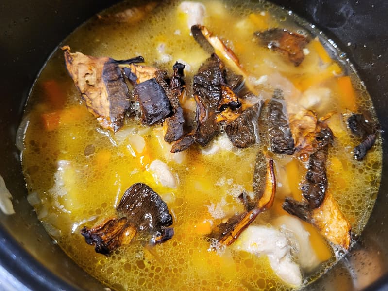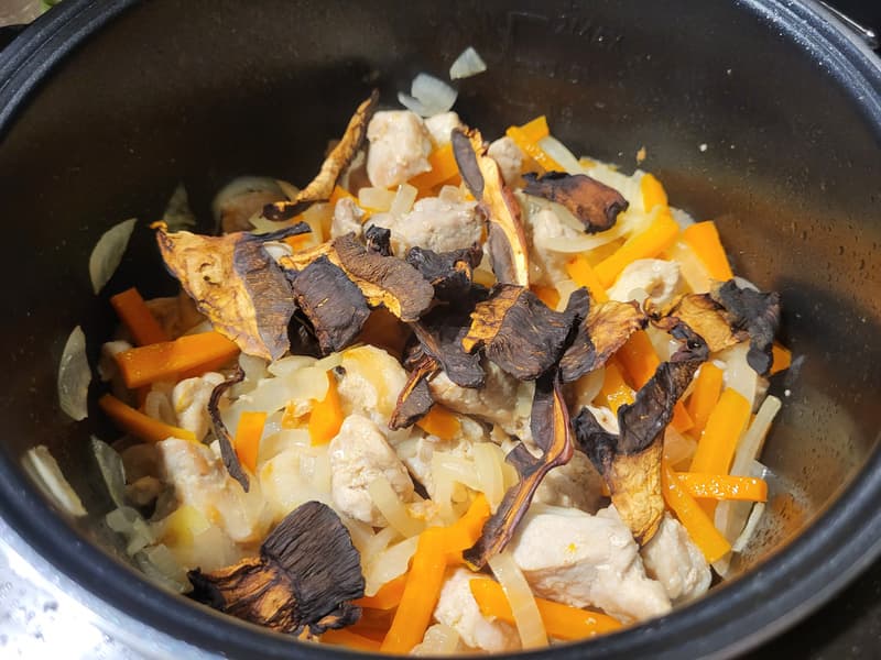 К обжаренным овощам добавили сушеные грибы и немного воды.