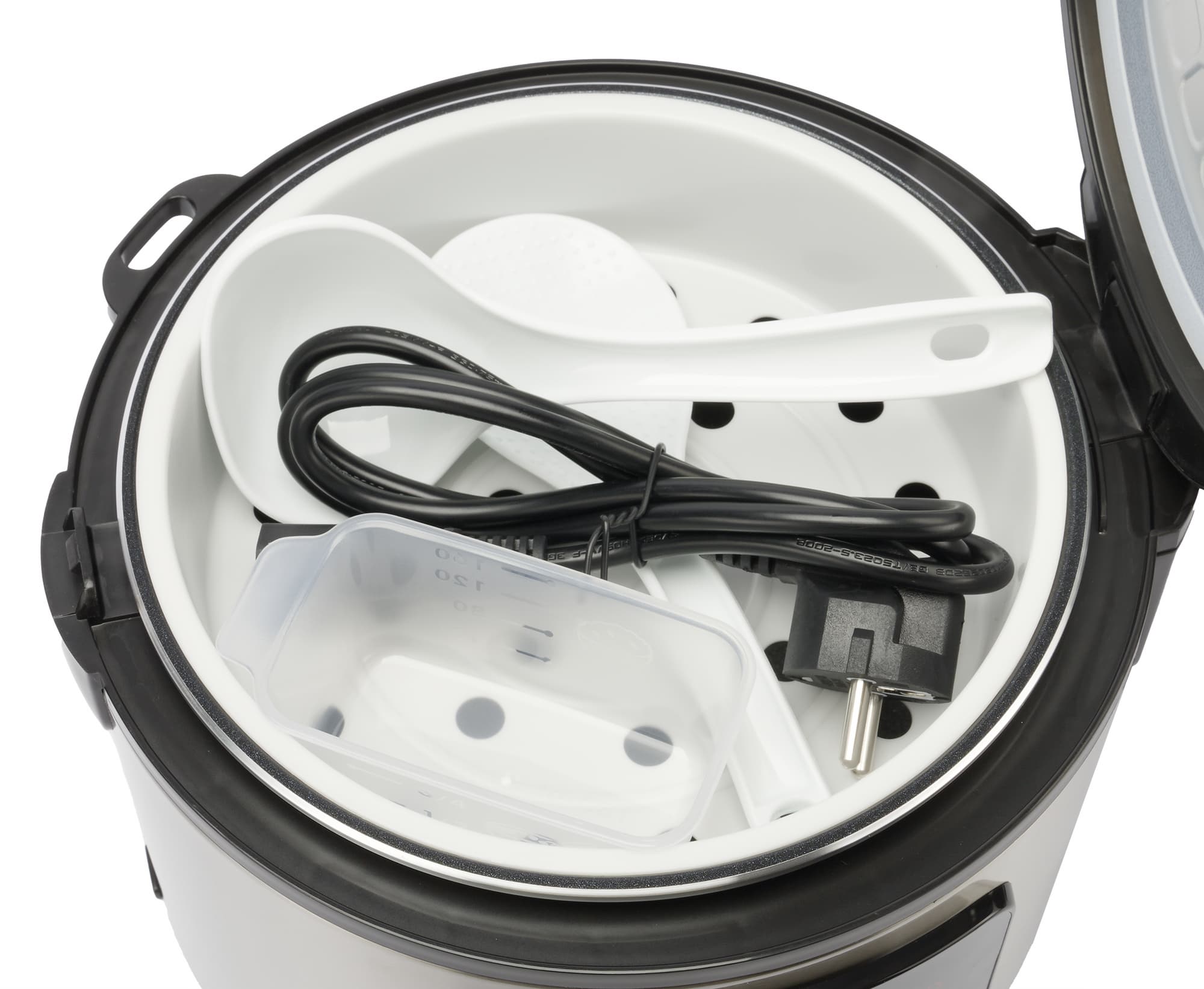 В комплект также входит контейнер для приготовления на пару́, плоская ложка, черпак, мерный стакан и электрический шнур.