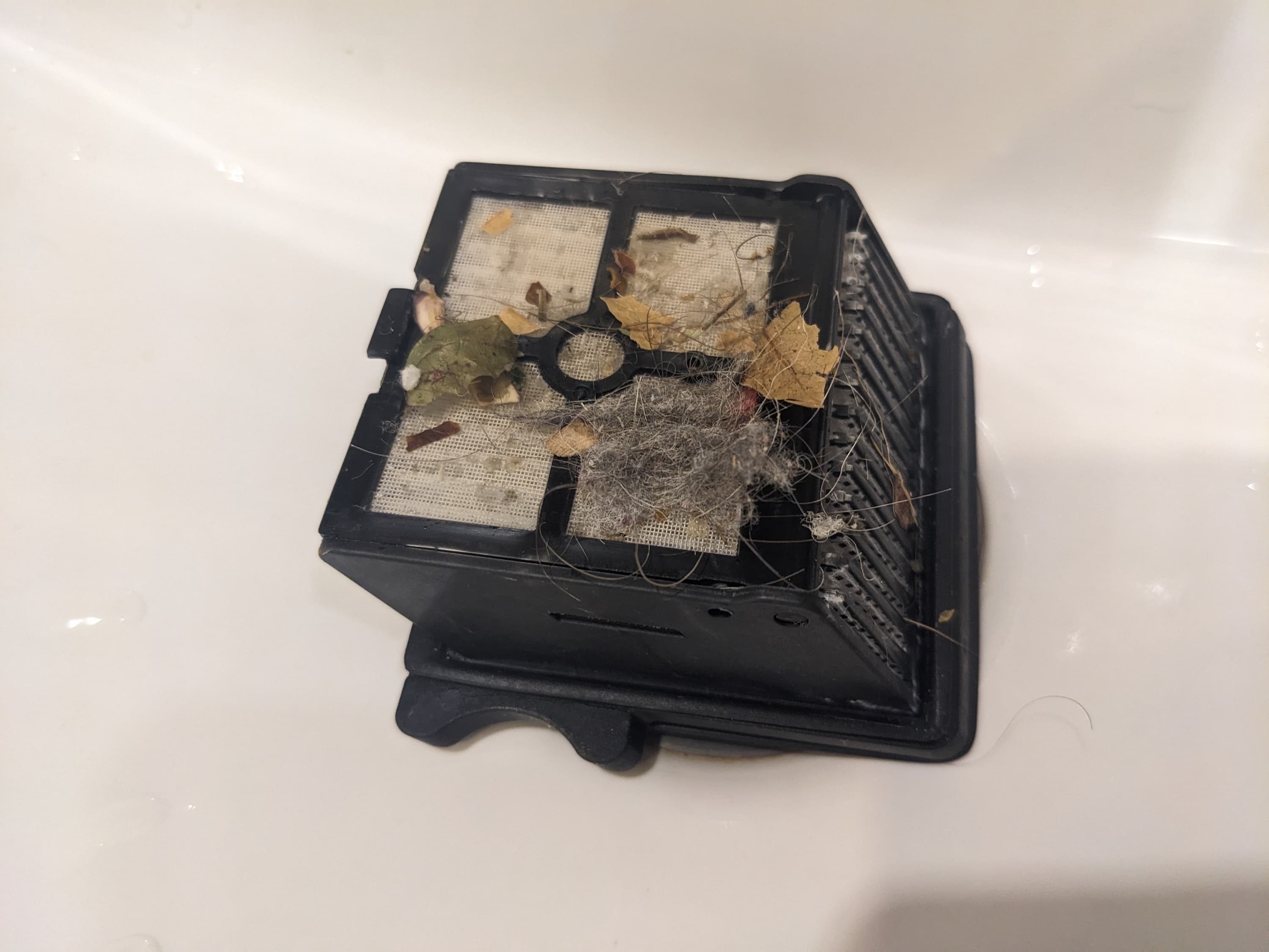 Крупный мусор эффективно задерживает решетка предварительного фильтра. Оставшееся на ней содержимое бака можно отправить в ведро, а жидкость из резервуара слить в канализацию, не боясь засорения.