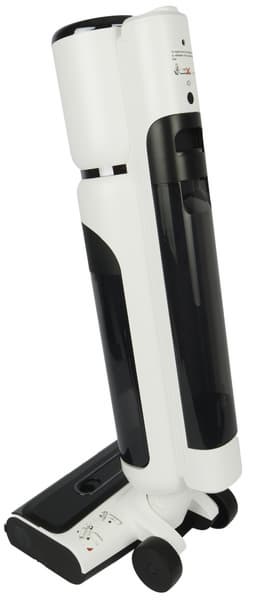Благодаря шарниру насадки для пола устройство может наклоняться в приблизительных пределах от 20 до 90 градусов относительно горизонтали. Также можно поворачивать щетку примерно на 45° вправо и влево. Под углом примерно в 100° пылесос встает в парковочное положение. Левая (если смотреть на прибор с точки зрения пользователя) сторона насадки заметно объемнее правой: здесь расположен привод ротора. Небольшая толщина правой стенки позволяет мыть пол почти вплотную к стенам и мебели.