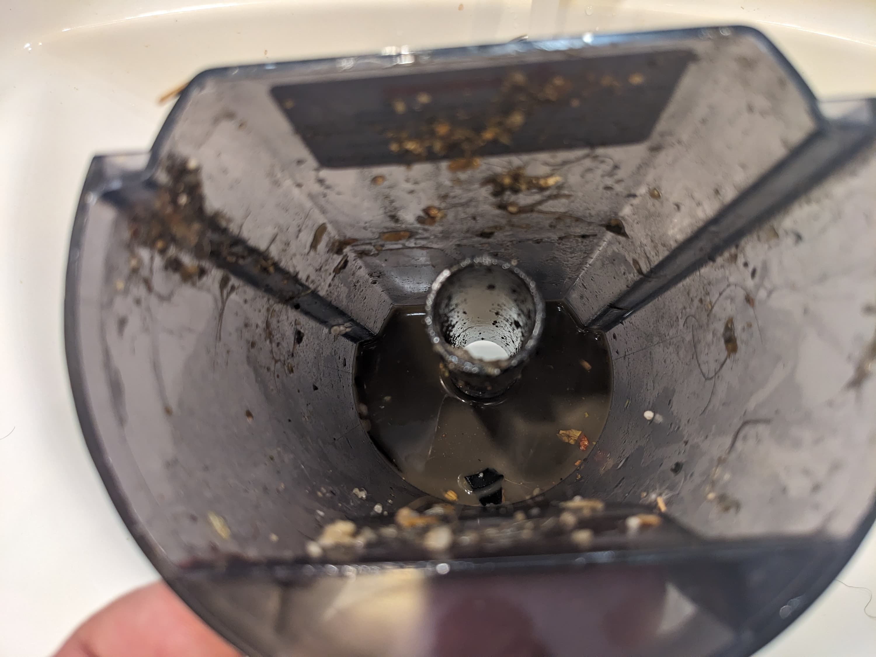 После завершения уборки необходимо сразу же, не откладывая, опорожнить и промыть резервуар для грязной жидкости, заполнить бак чистой водой, установить пылесос на базу и включить самоочистку двойным нажатием на кнопку. Если уровень заряда аккумулятора близок к минимальному, запустить процедуру сразу же не удастся: полностью севшее устройство должно постоять на базе минут двадцать. В этом случае пользователю придется самостоятельно вспомнить о необходимости обслуживания, иначе непромытые ротор и мусоросборник начнут неприятно пахнуть.
