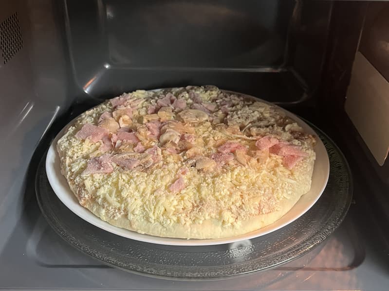 Положили пиццу на тарелку и поместили на стеклянный поддон.