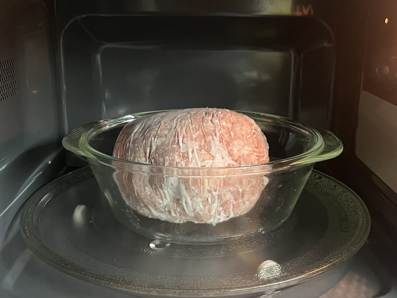 По истечении времени мы достали форму с фаршем из микроволновой печи и выяснили, что с внешних сторон шар размягчился до идеальной консистенции свежего фарша, а вот его «ядро» осталось подмерзшим.