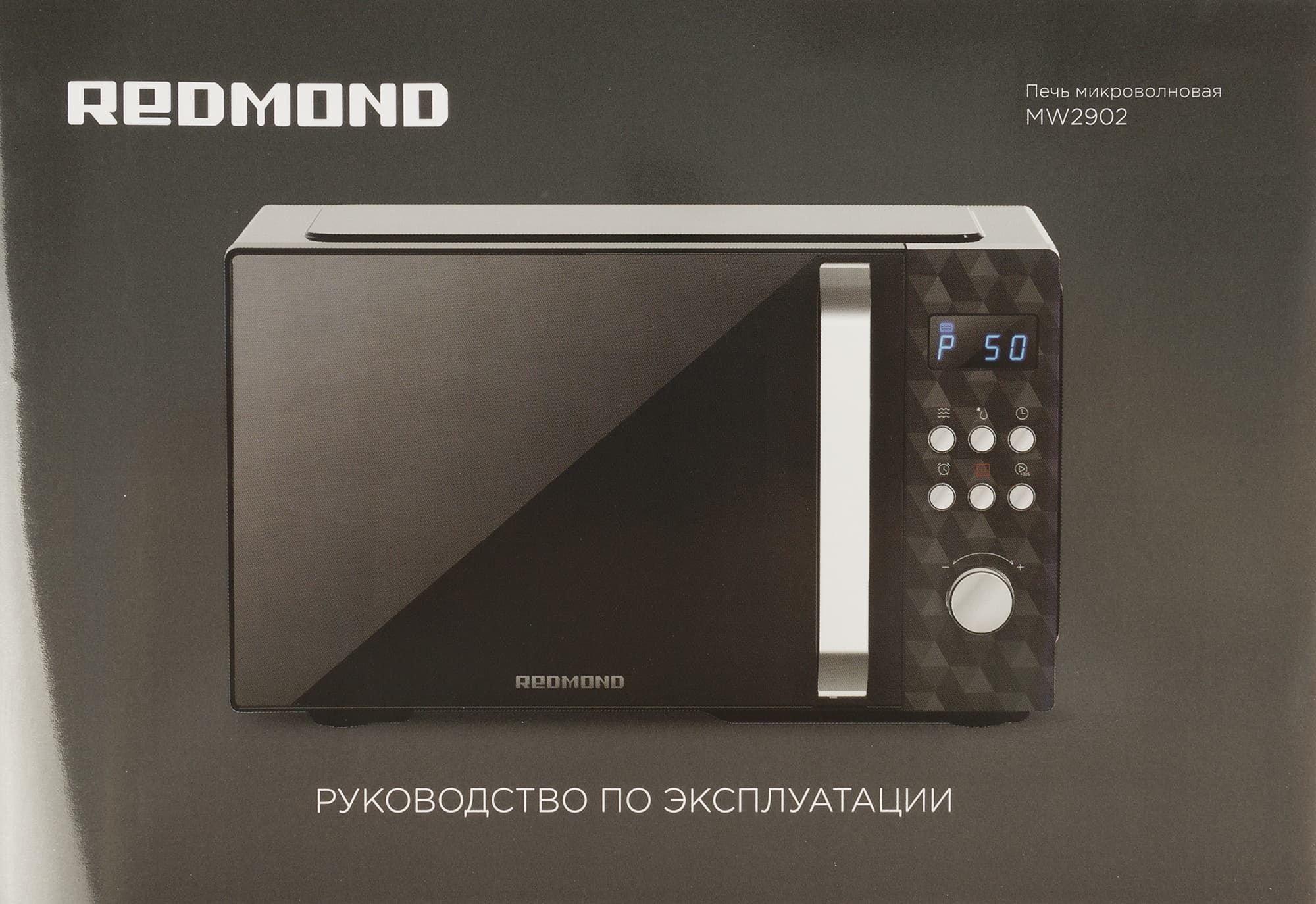 Микроволновая печь Redmond MW2902 в основном черного цвета и имеет серебристые акценты в виде ручки, кнопок, поворотного переключателя и логотипа компании на дверце.