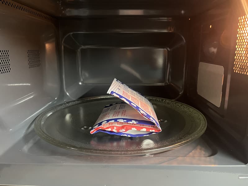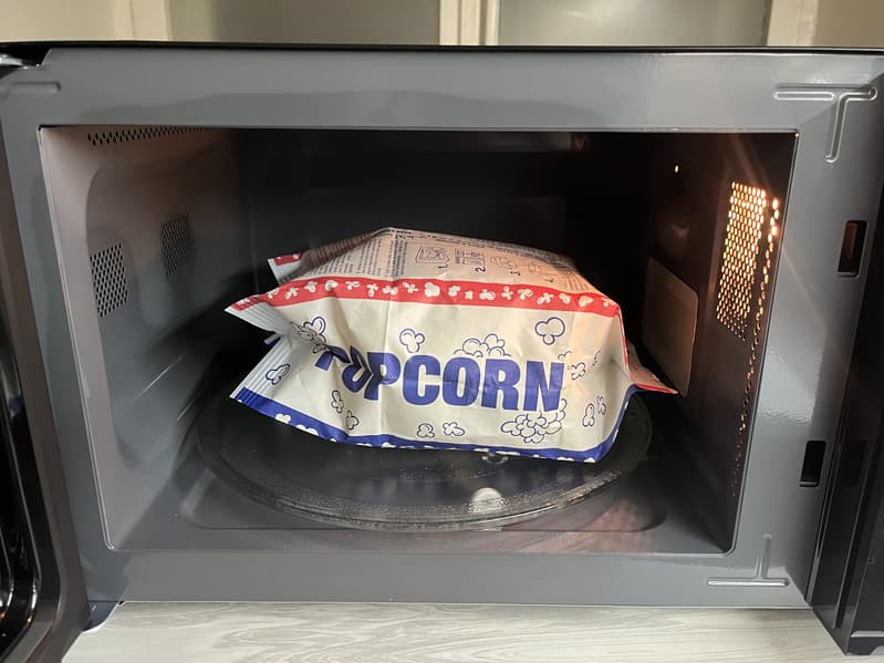 Положили пакетик с зернами на стеклянный столик внутри камеры и установили данные веса для запуска автопрограммы. Микроволновая печь установила время работы 2 минуты.