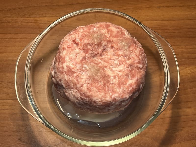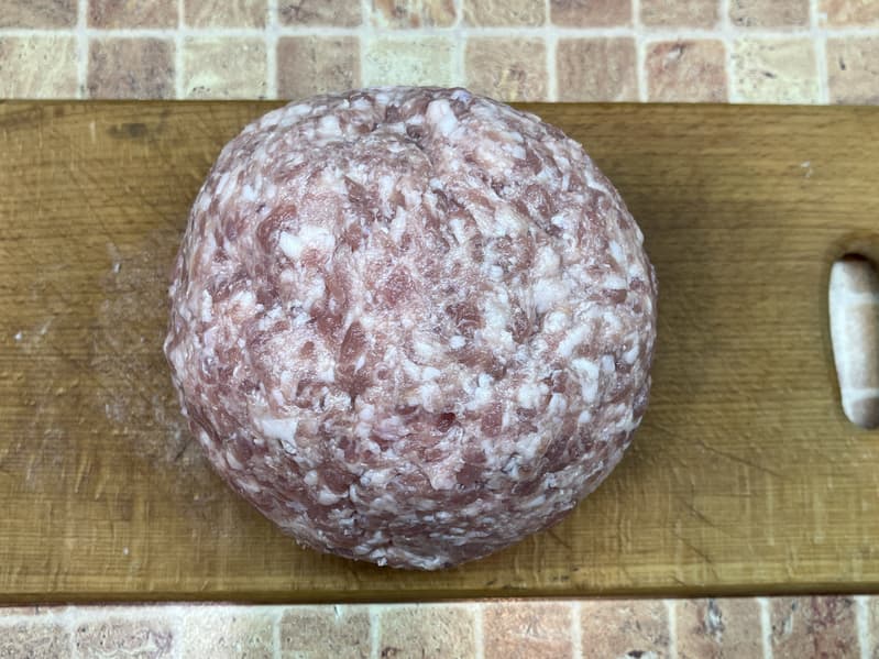 Для теста мы взяли 800 г свежего фарша, слепили из него шар и заморозили.