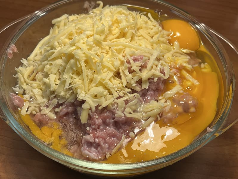 фарш мясной — 800 г, сыр — 150 г, яйца — 3 шт., соль и молотый перец — по вкусу