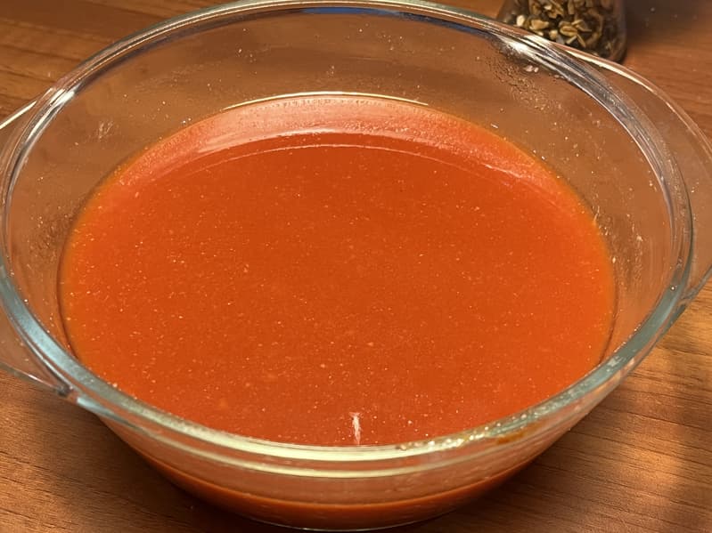 Далее вскипятили в нашей жаропрочной форме 900 мл воды, добавили в нее банку томатной пасты, специи и перемешали всё до однородного состояния.